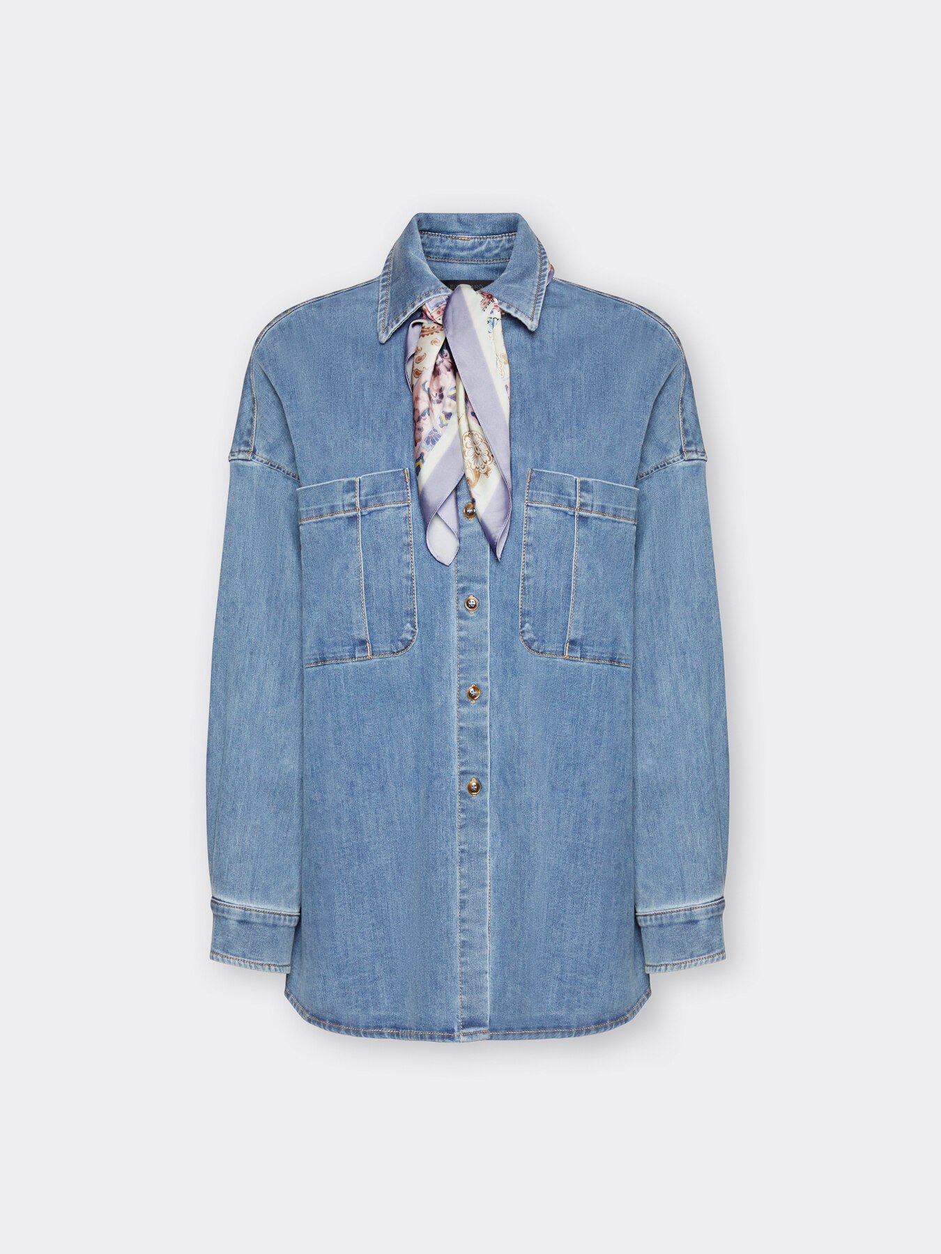 Camicia in denim washed dal taglio over con tasche applicate e foulard stampato rimovibile. Il lavaggio stone washed crea un effetto vintage. Si abbina a pantaloni in maglia o gonna per un look versatile e raffinato.