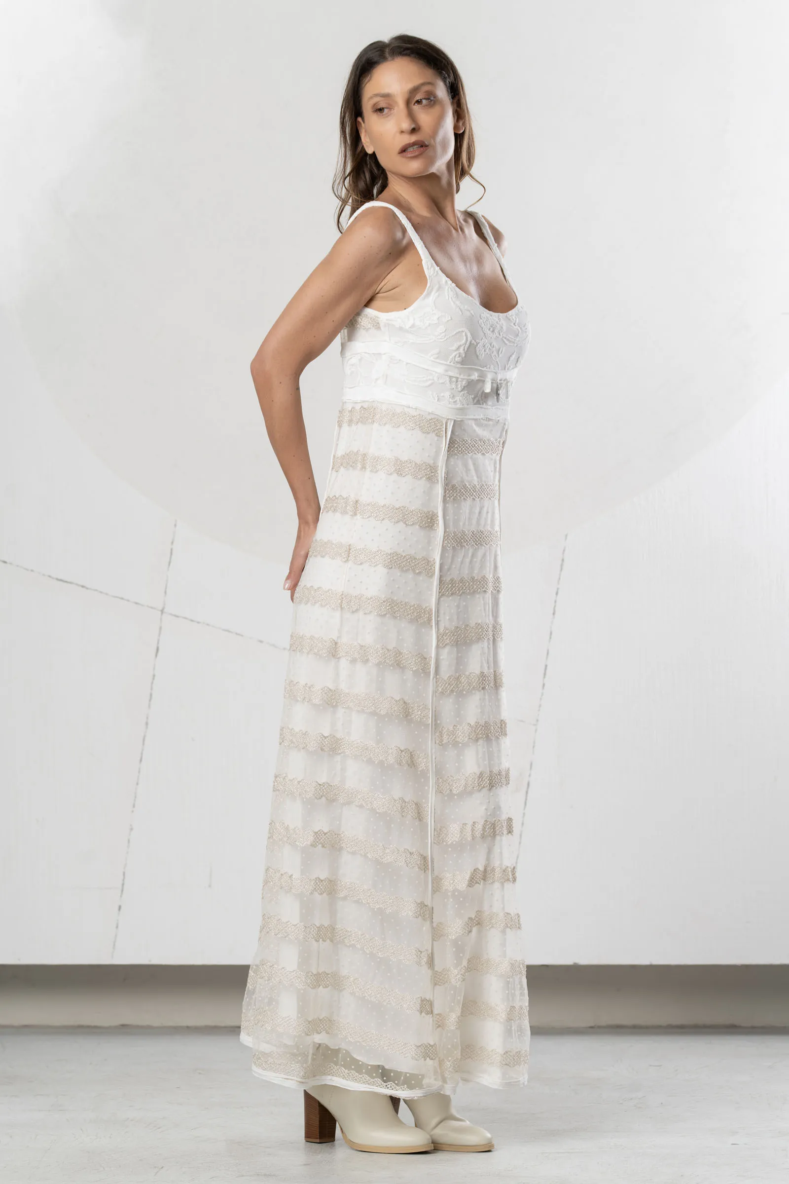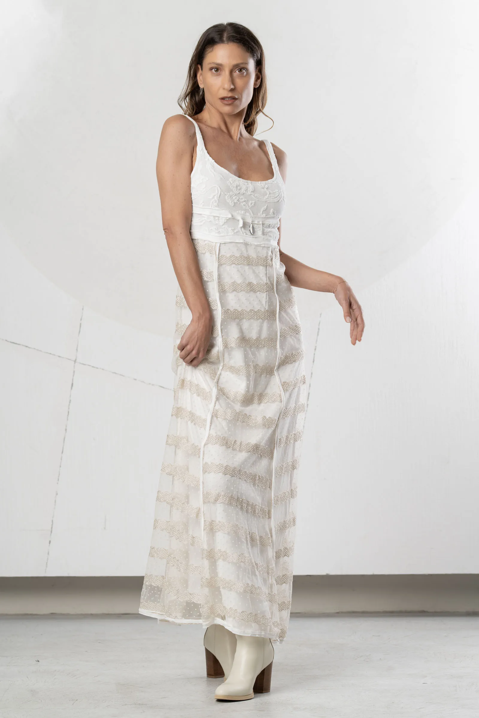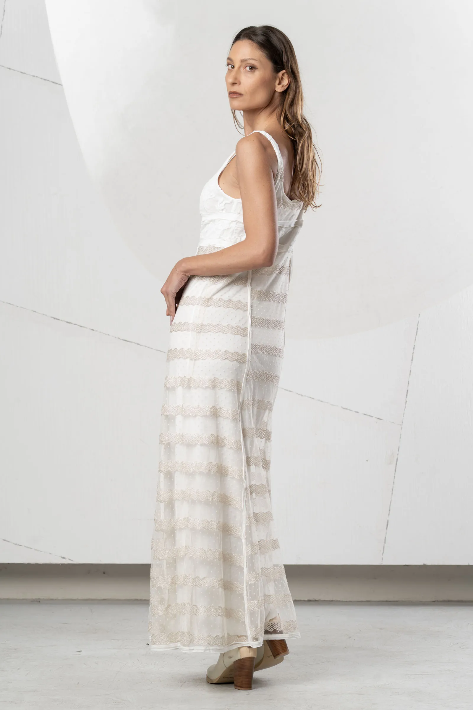 Abito lungo in tulle avorio. Corpetto con ricamo floreale in rilievo. Gonna in tulle con pizzo smerlato e pois. Abito luminoso per look chic e romantici.