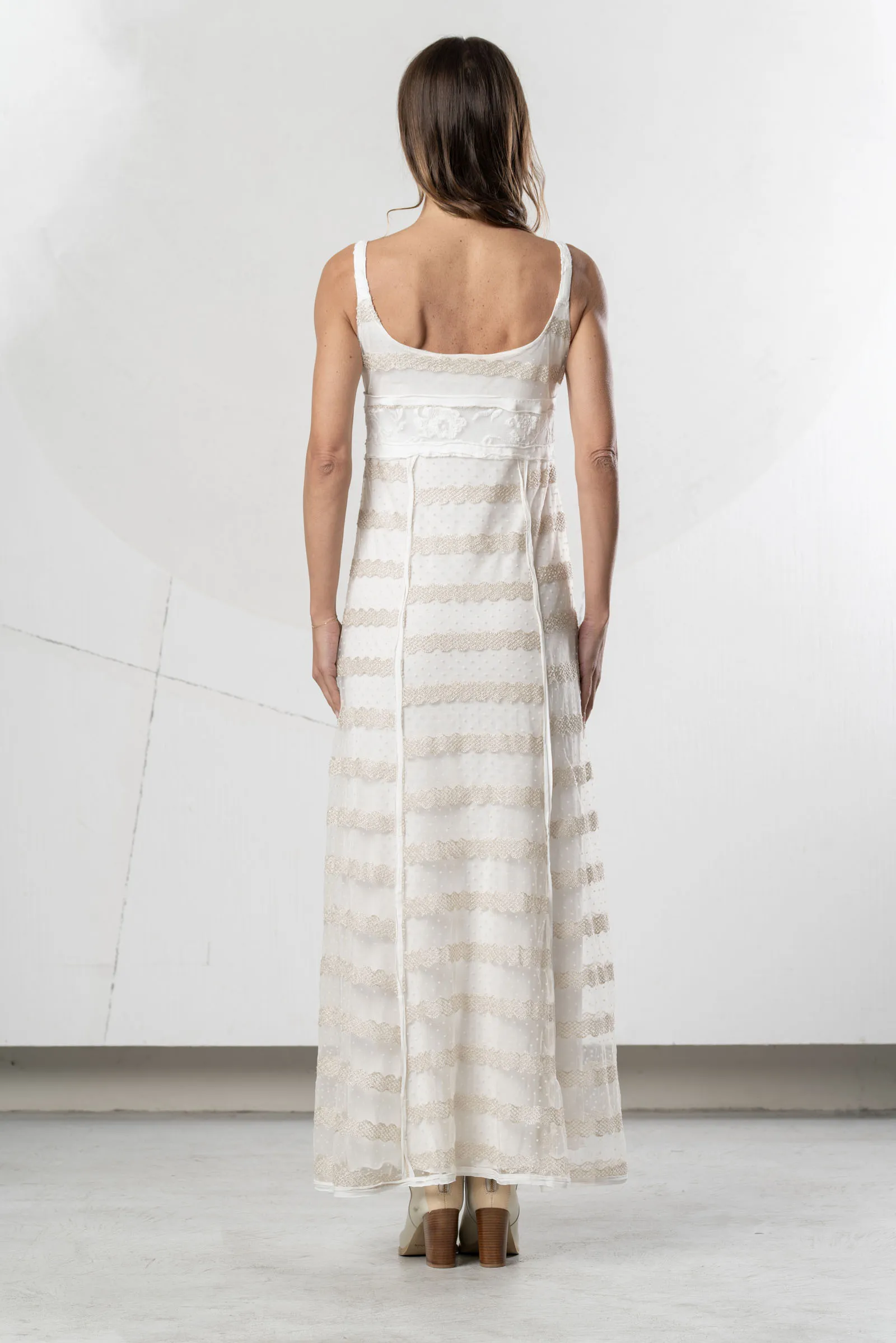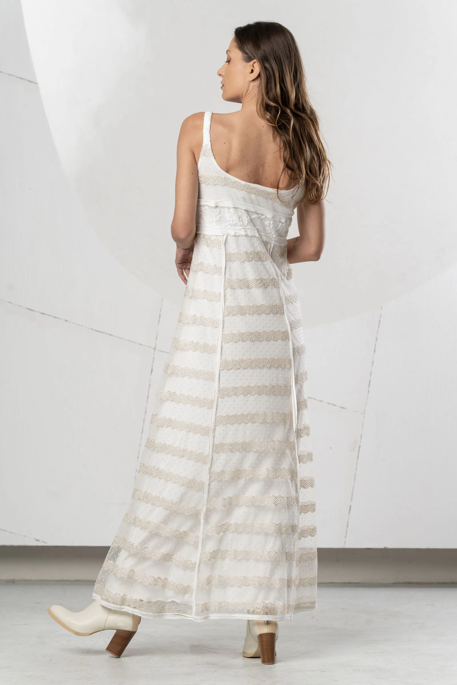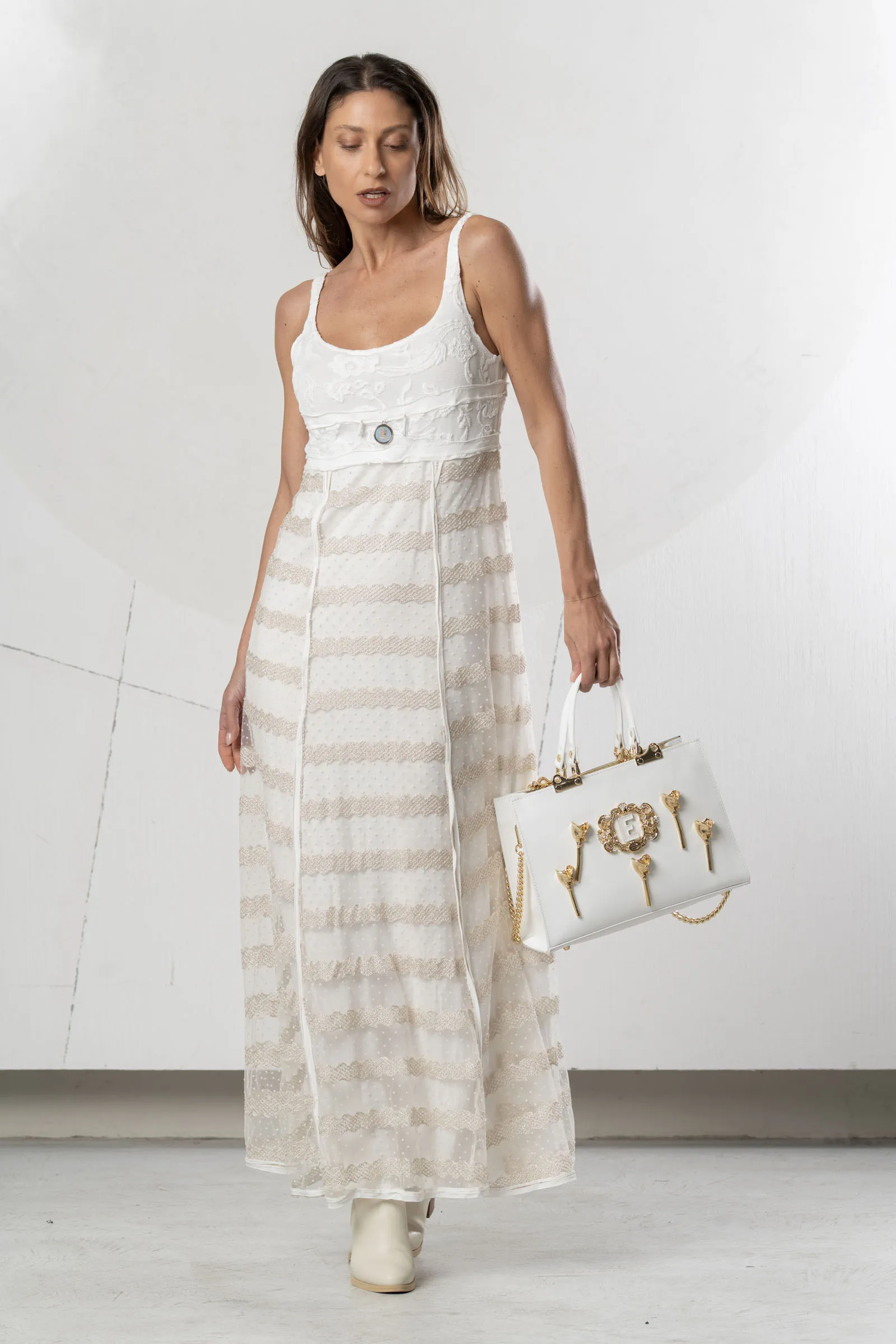Abito lungo in tulle avorio. Corpetto con ricamo floreale in rilievo. Gonna in tulle con pizzo smerlato e pois. Abito luminoso per look chic e romantici.