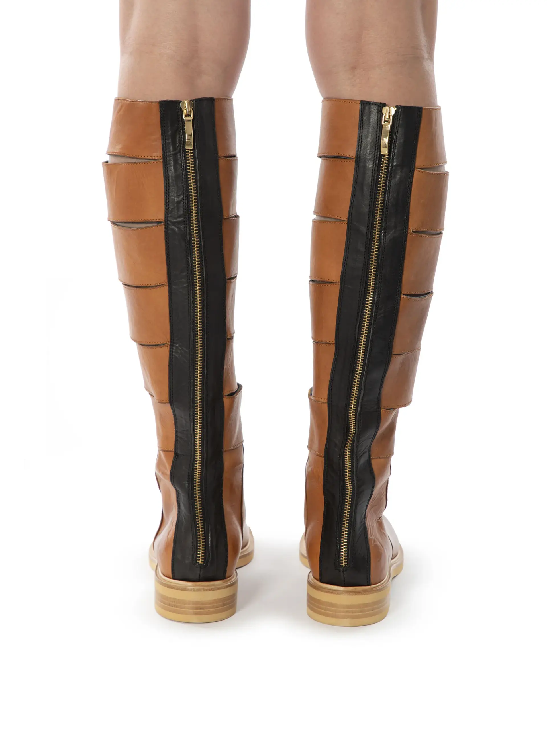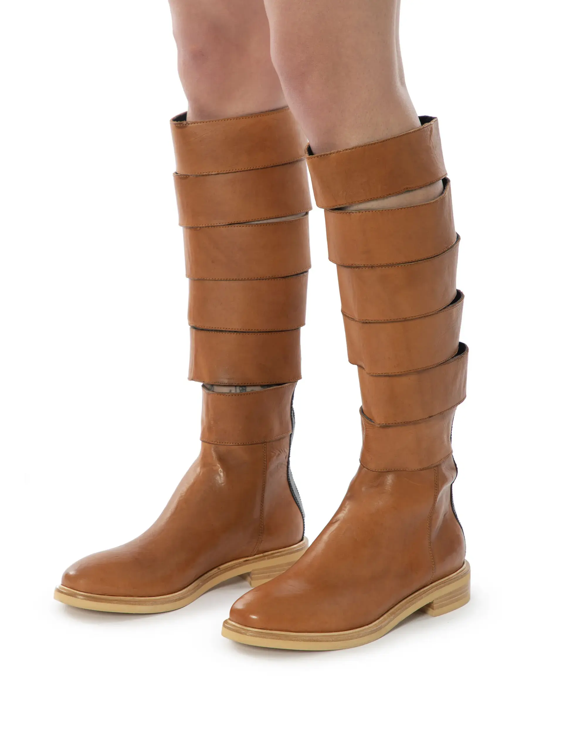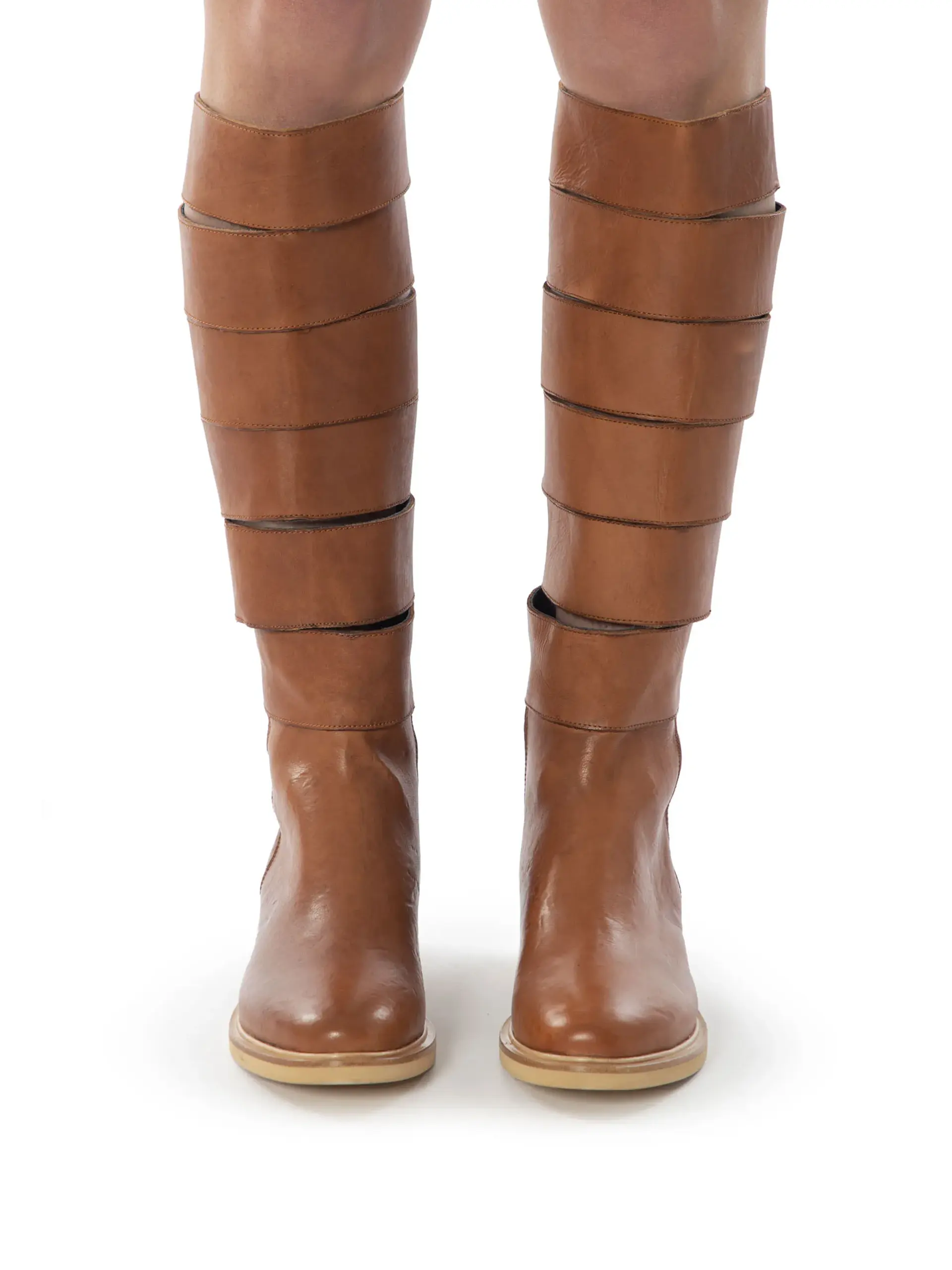 Stivali in vera pelle marrone cuoio. Chiusura con cerniera posteriore, suola in cuoio e tacchetto di circa 3 cm per slanciare la figura. Stivale altezza ginocchio. Stivale iconico by Daniela Dallavalle, elegante per tutti i look e da usare in tutte le occasioni.