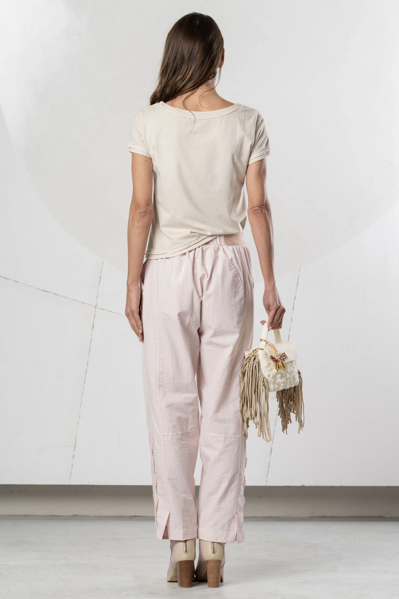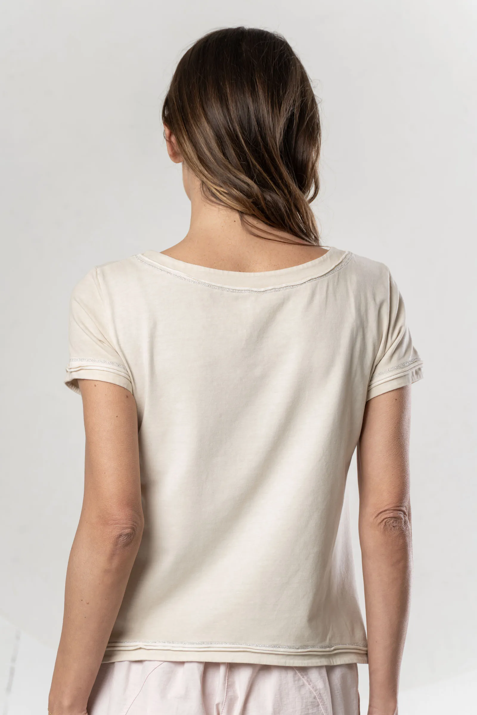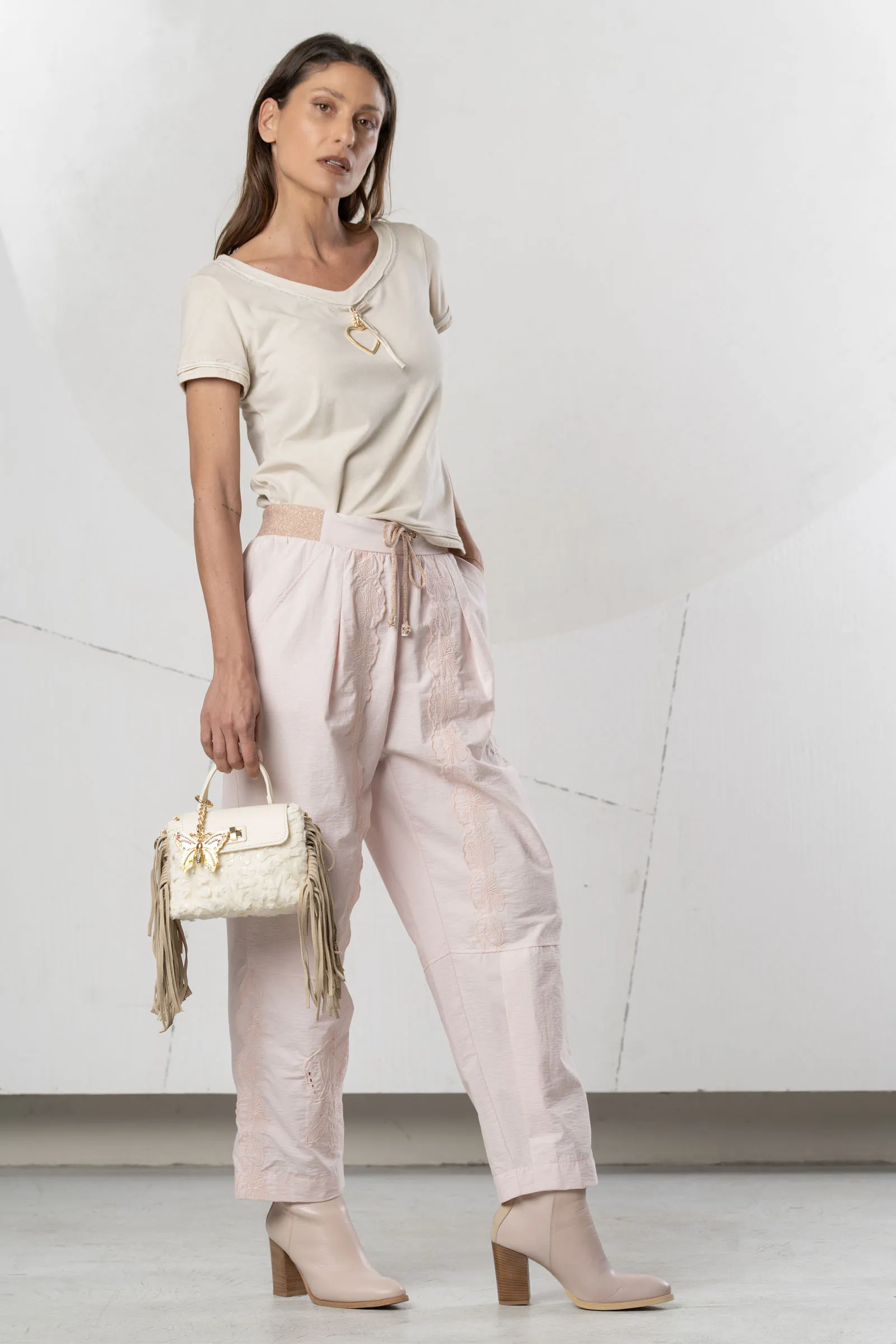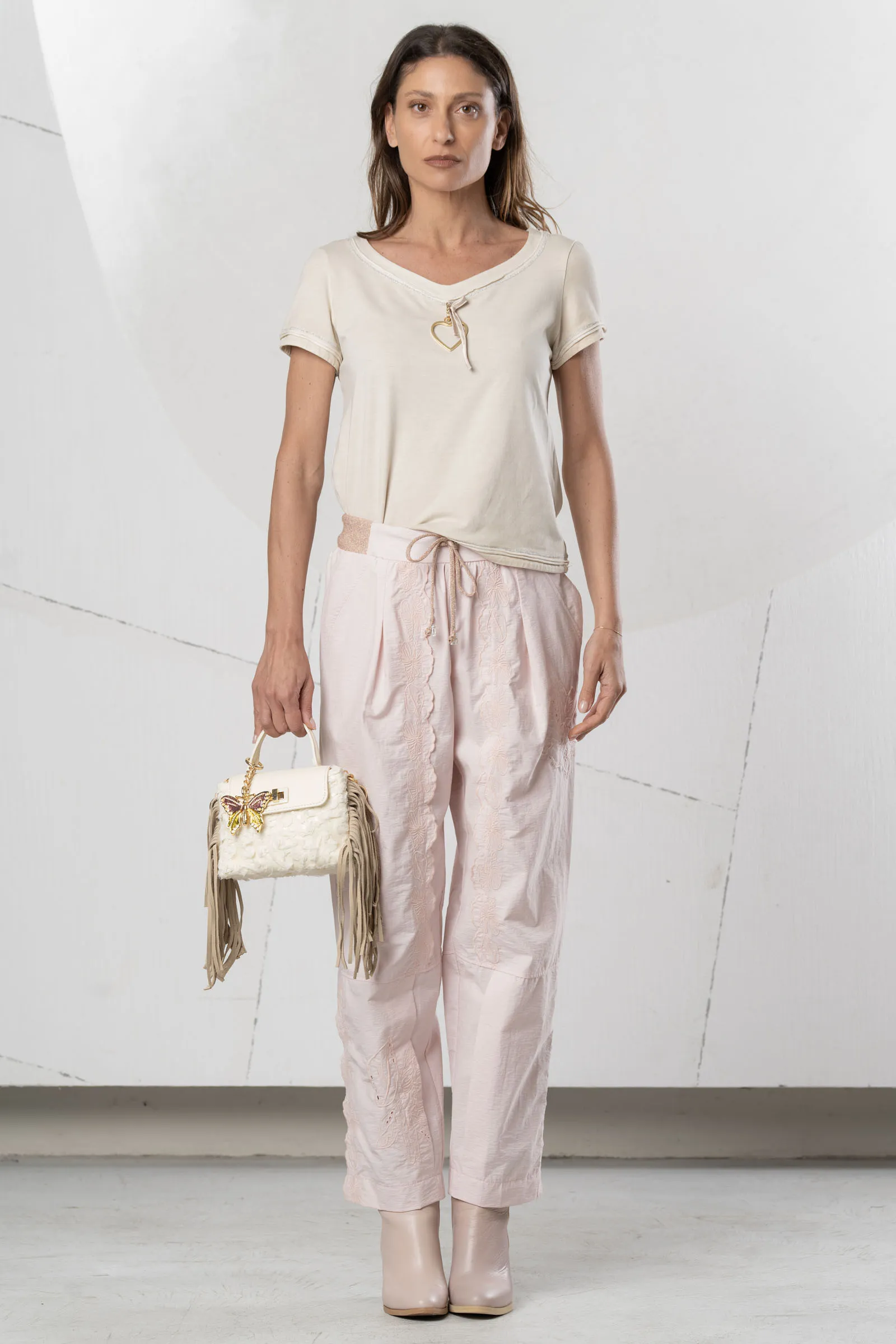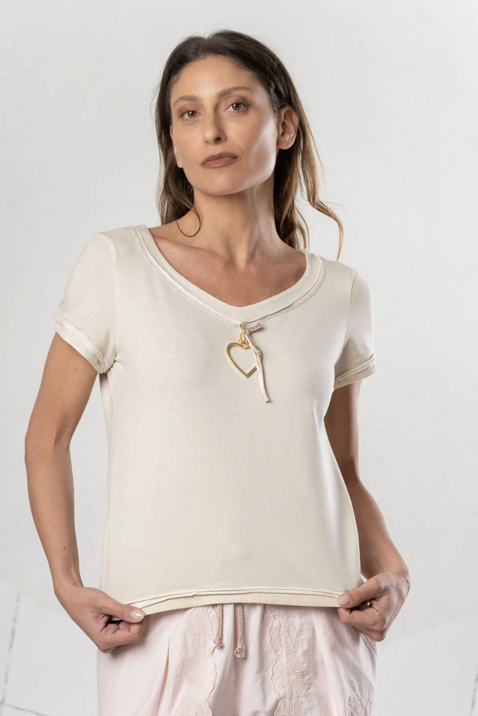 ELISA CAVALETTI – T-shirt beige con cuore pendente e bordi lurex
