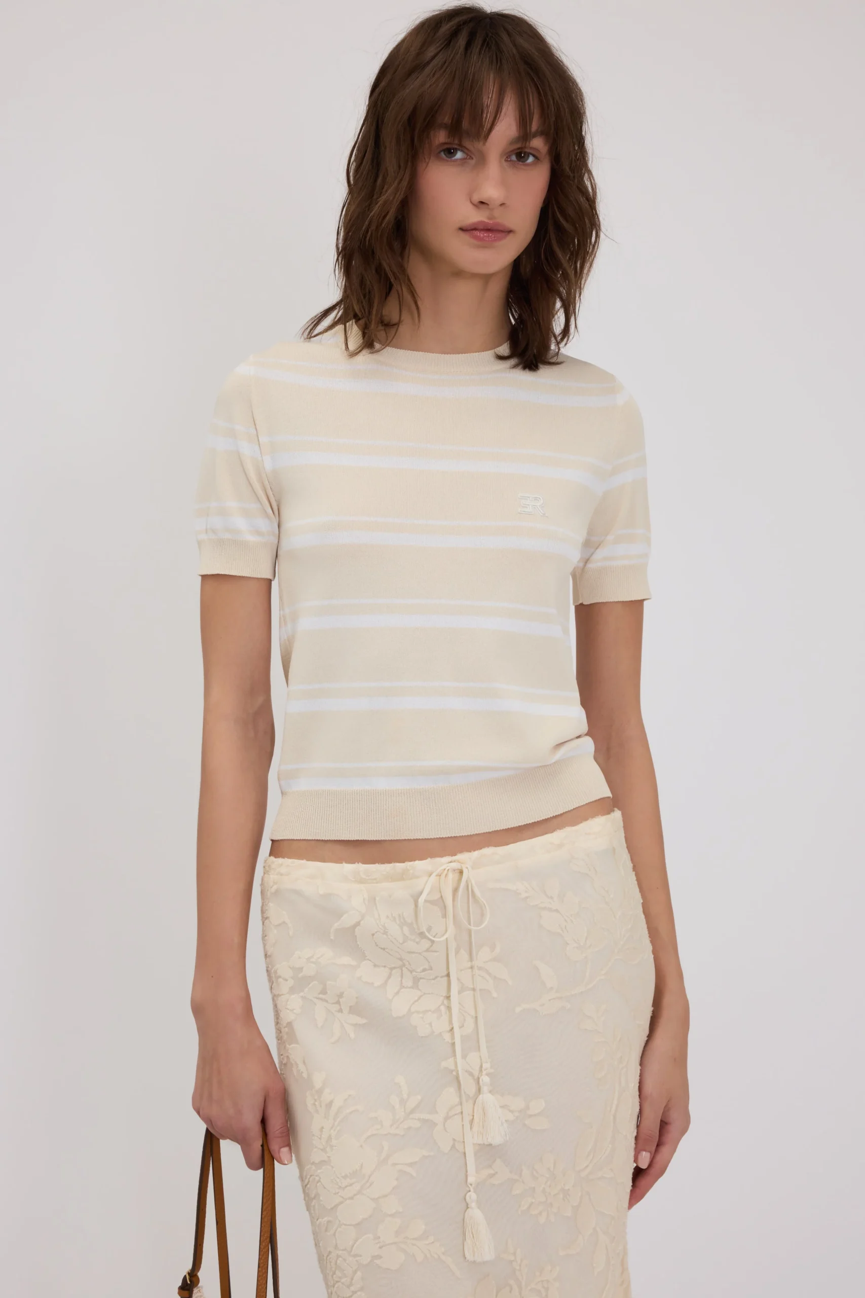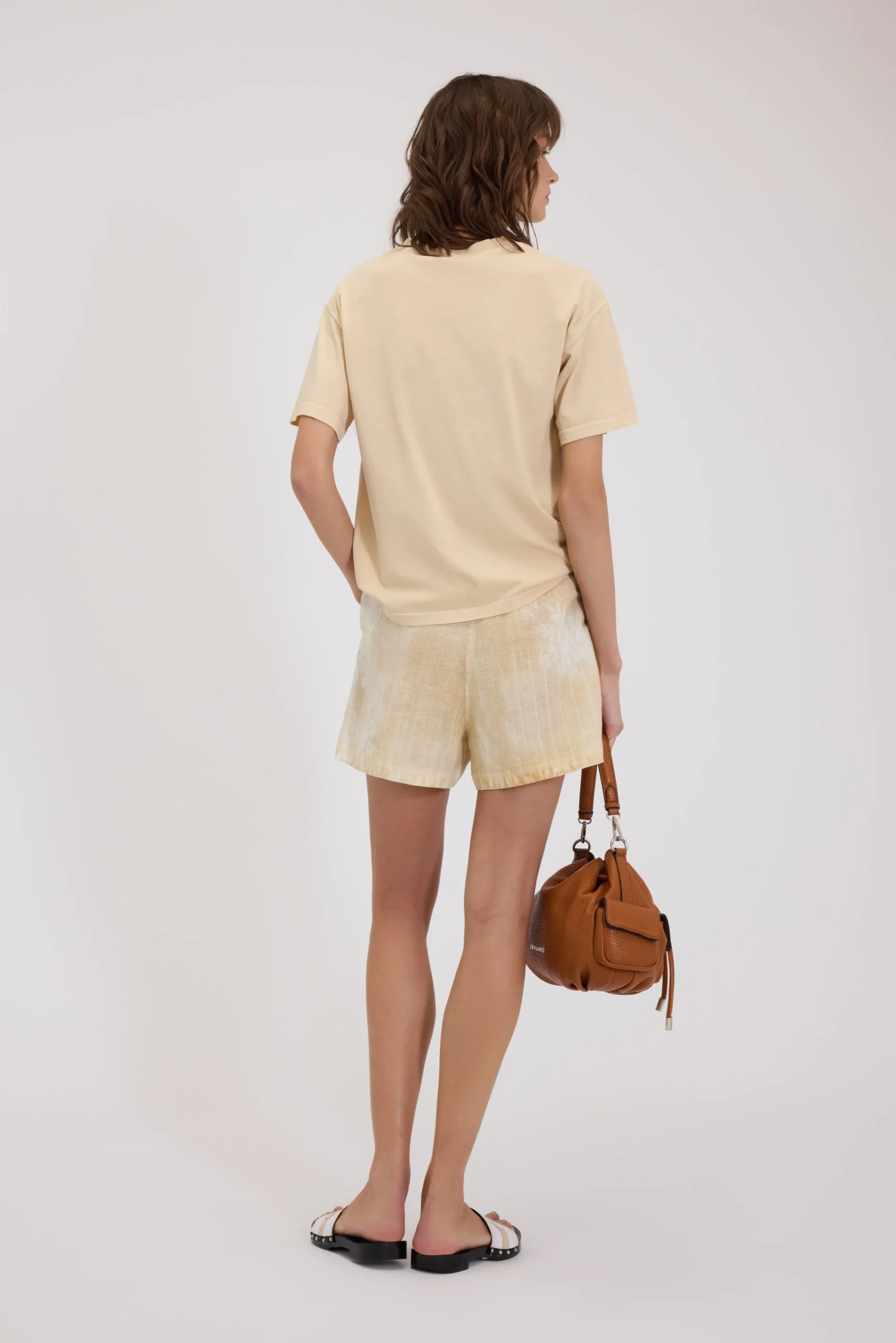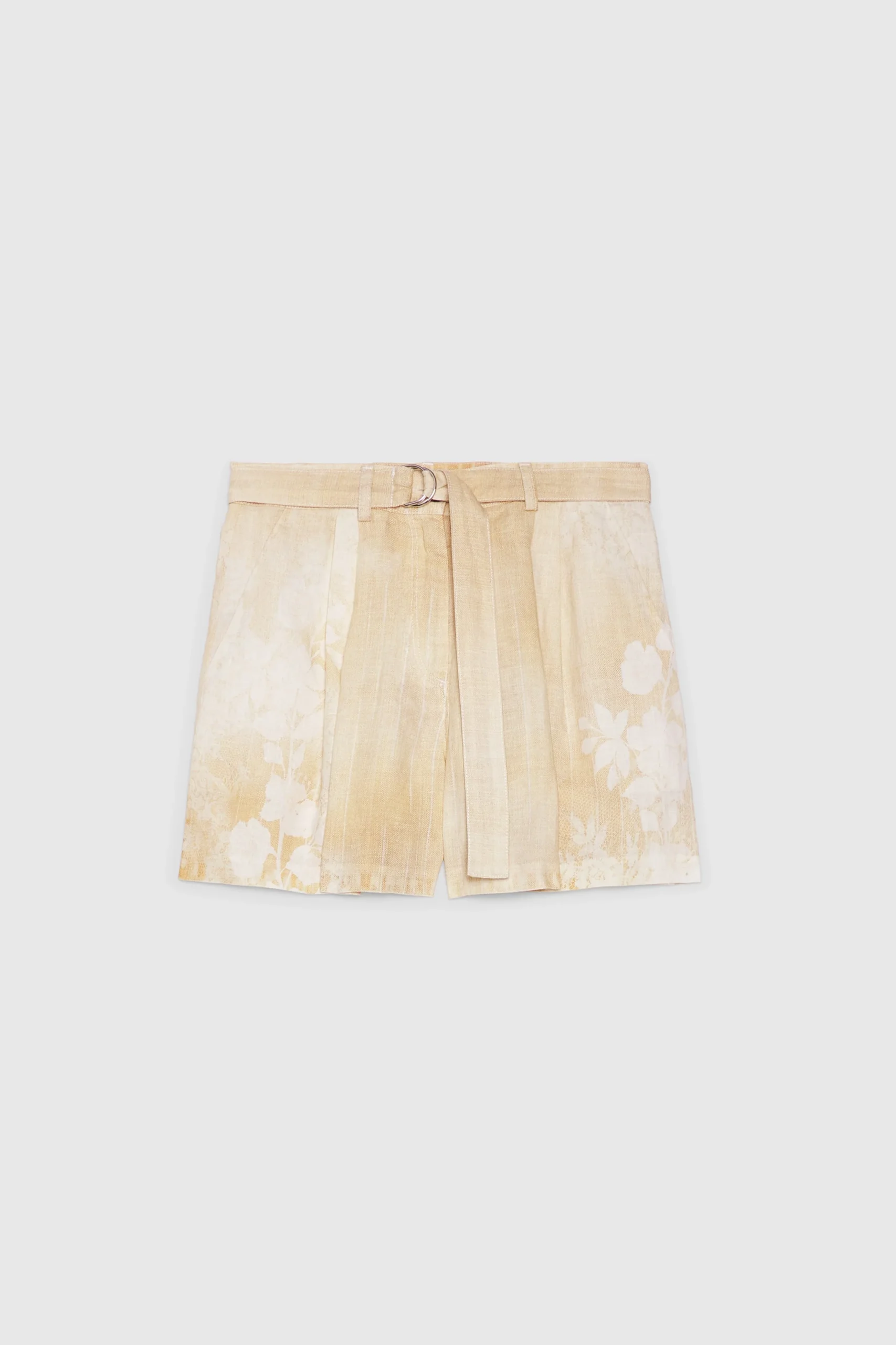 Bermuda in puro lino. Stampa con patchwork sfumato di fiori, pizzo e gessato. Vita regolare con cintura in tessuto, gamba ampia con pieghe sul davanti e tasche nei fianchi.
