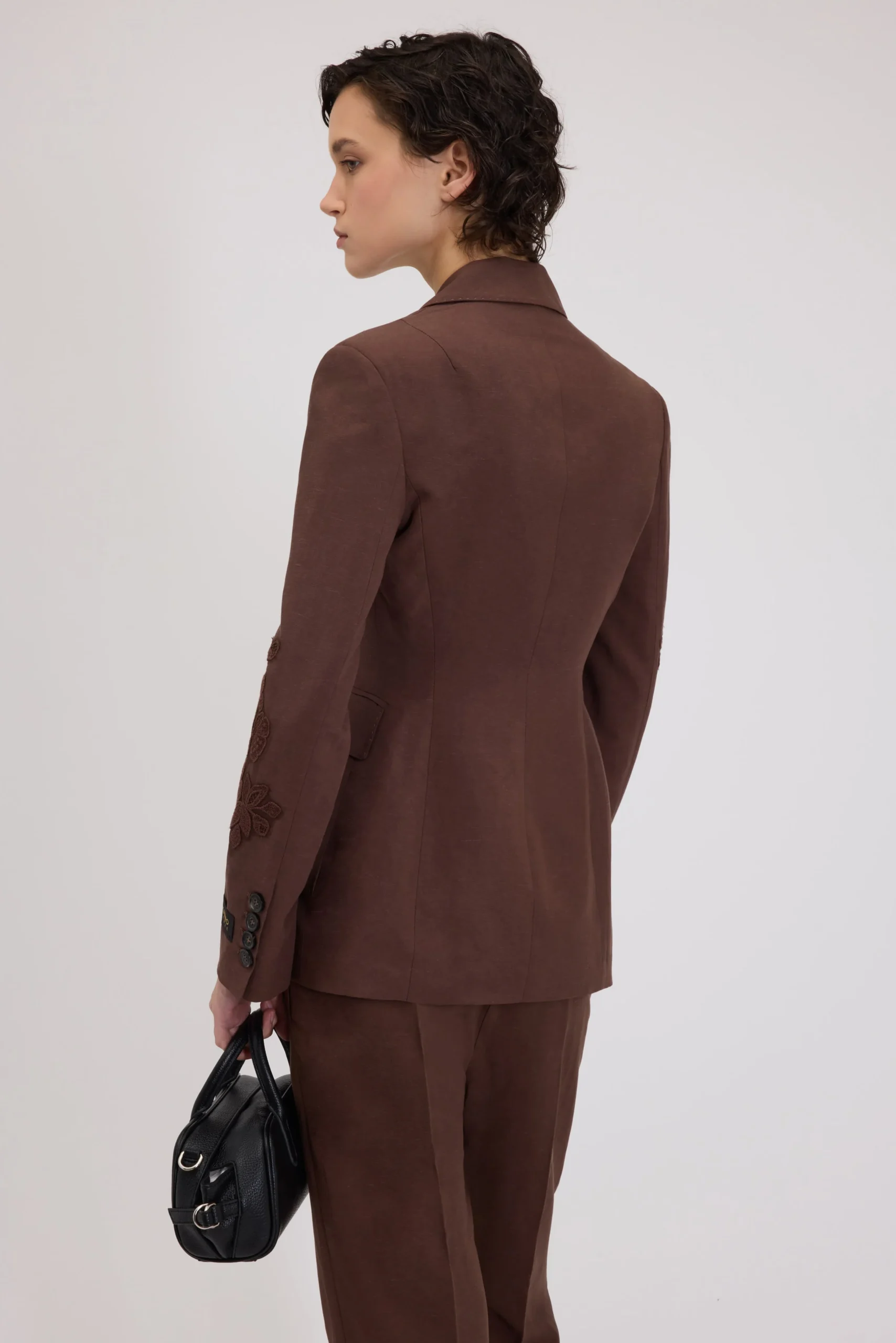 Blazer doppiopetto in misto lino con vita sfiancata per una silhouette iperfemminile. Le maniche sono impreziosite da ricami floreali tono su tono.