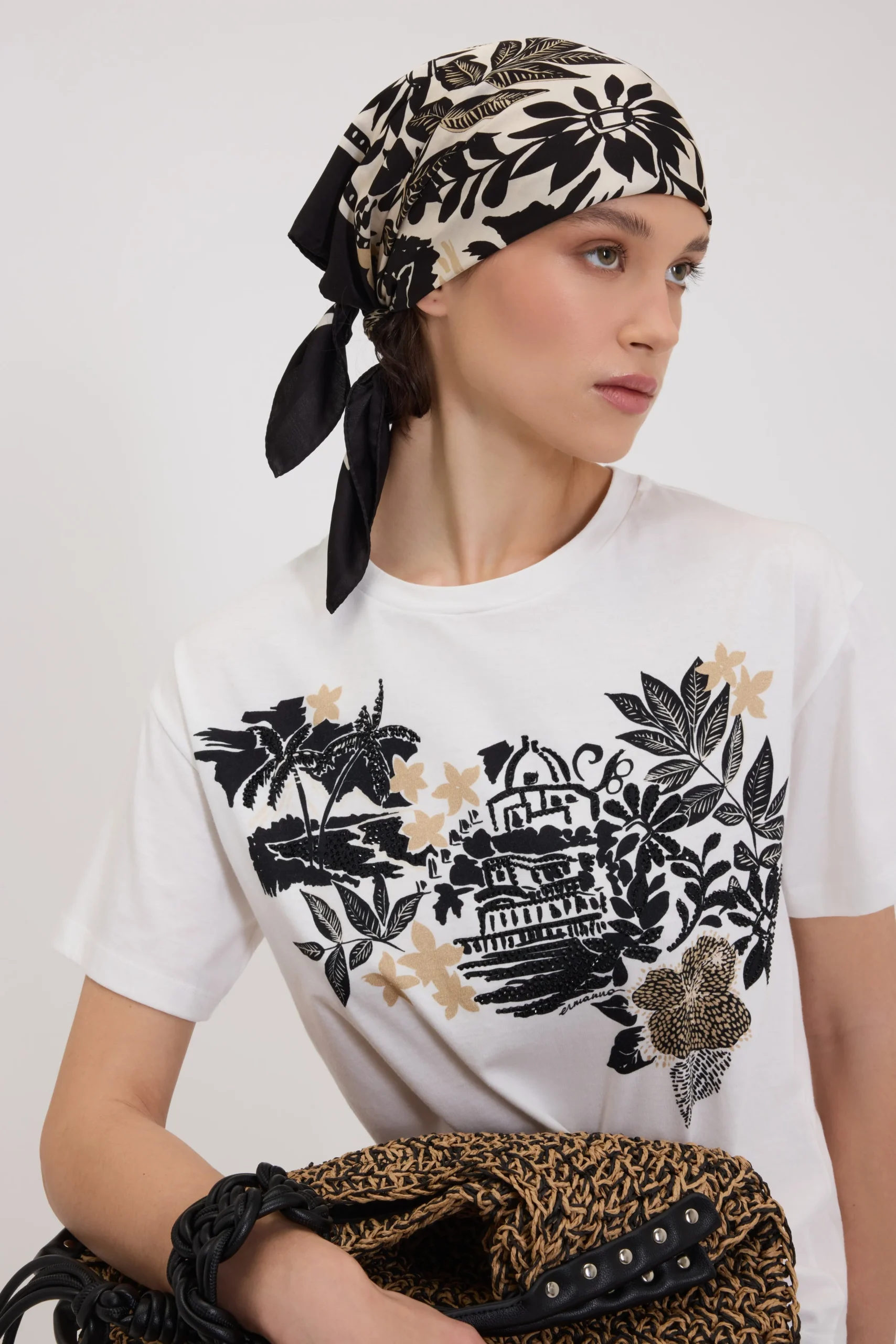 Foulard quadrato in raso di viscosa con stampa tropicale e cornice a foulard unita. Logo stampato su un lato.