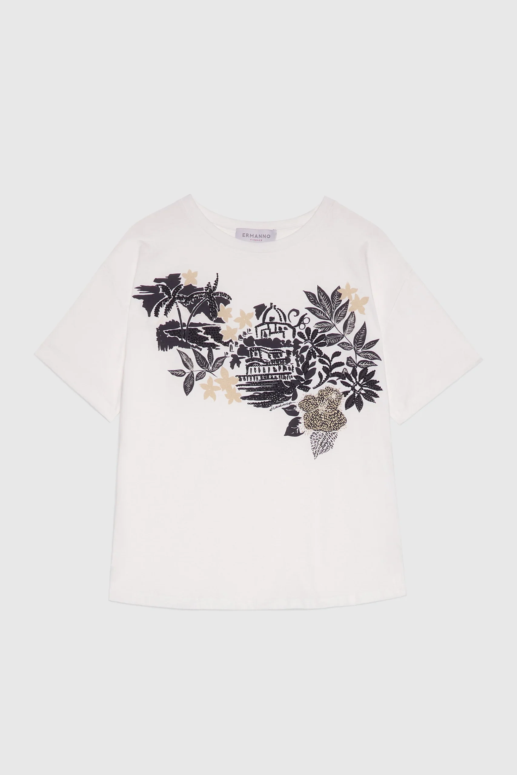 T-shirt regular in jersey di cotone con stampa tropicale bicolore e cristalli termoadesivi.