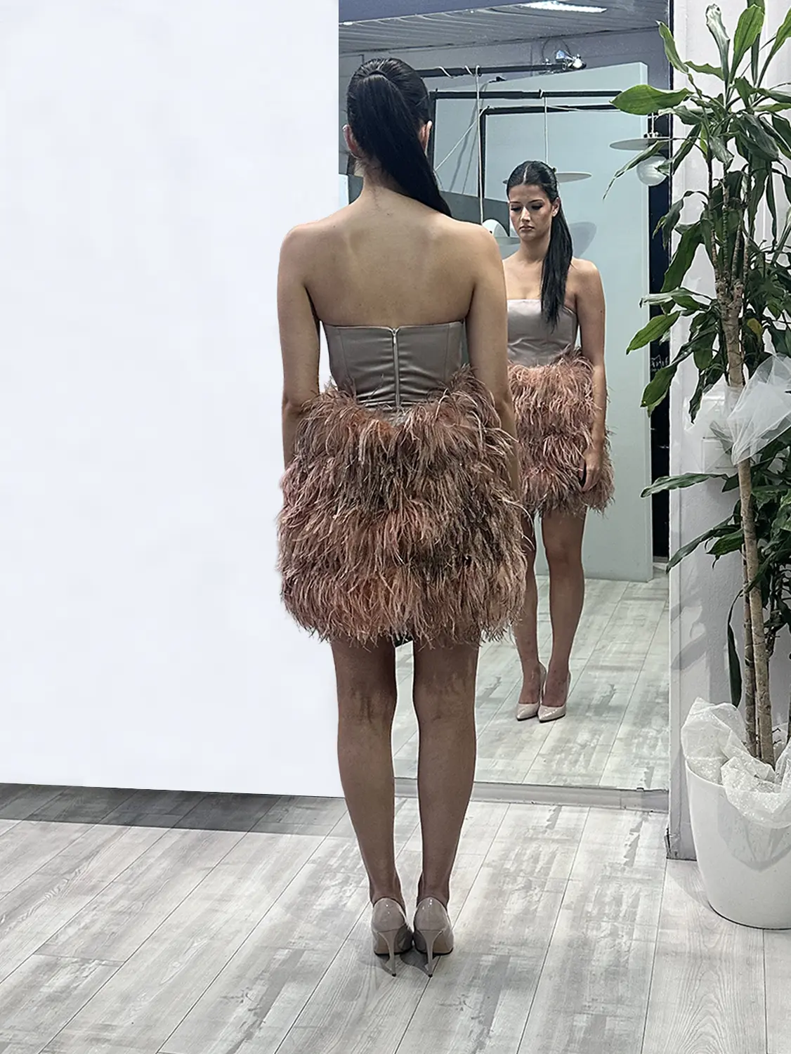 NOELL MAGGINI – Abito corto con gonna decorata in piume