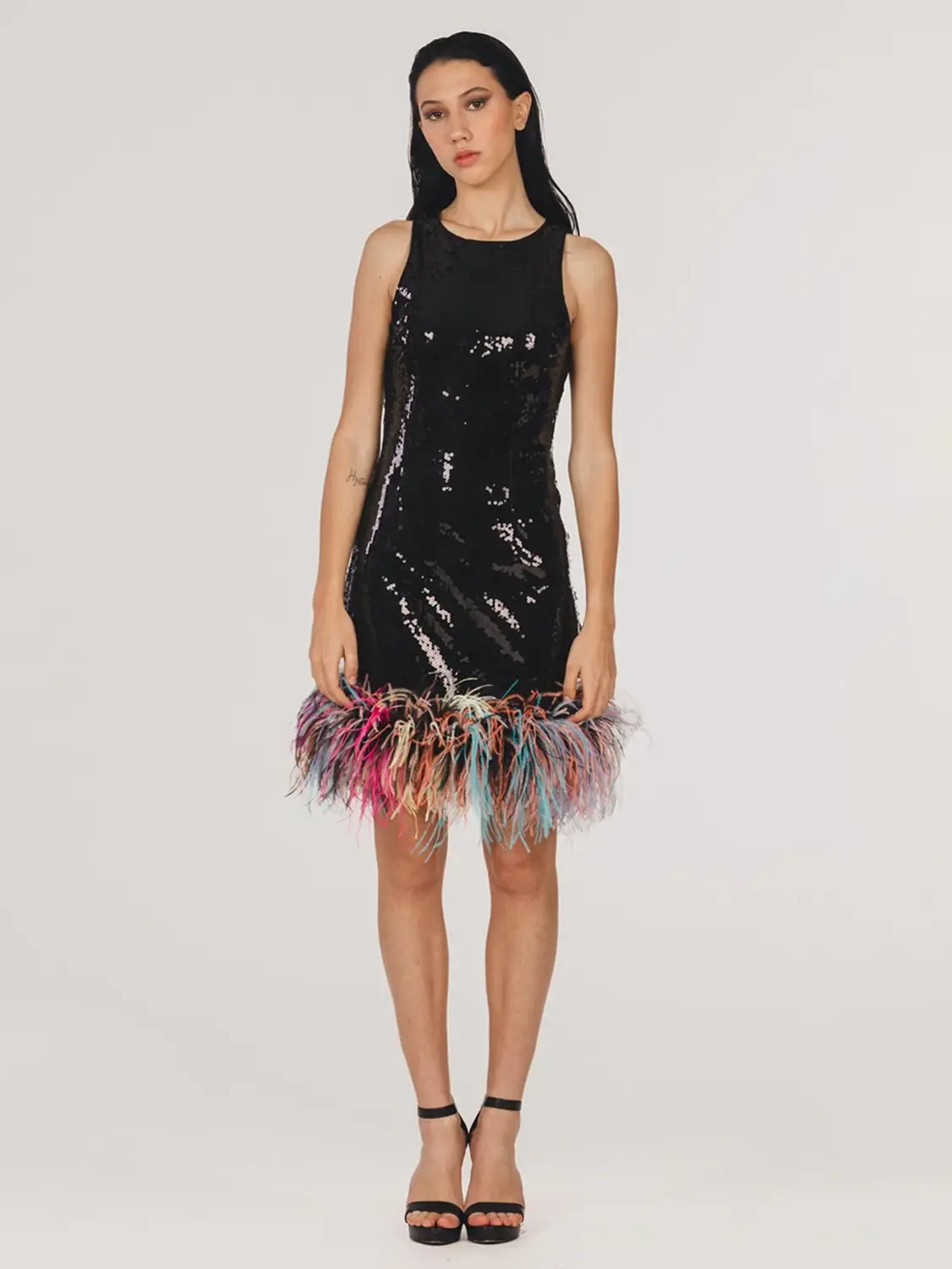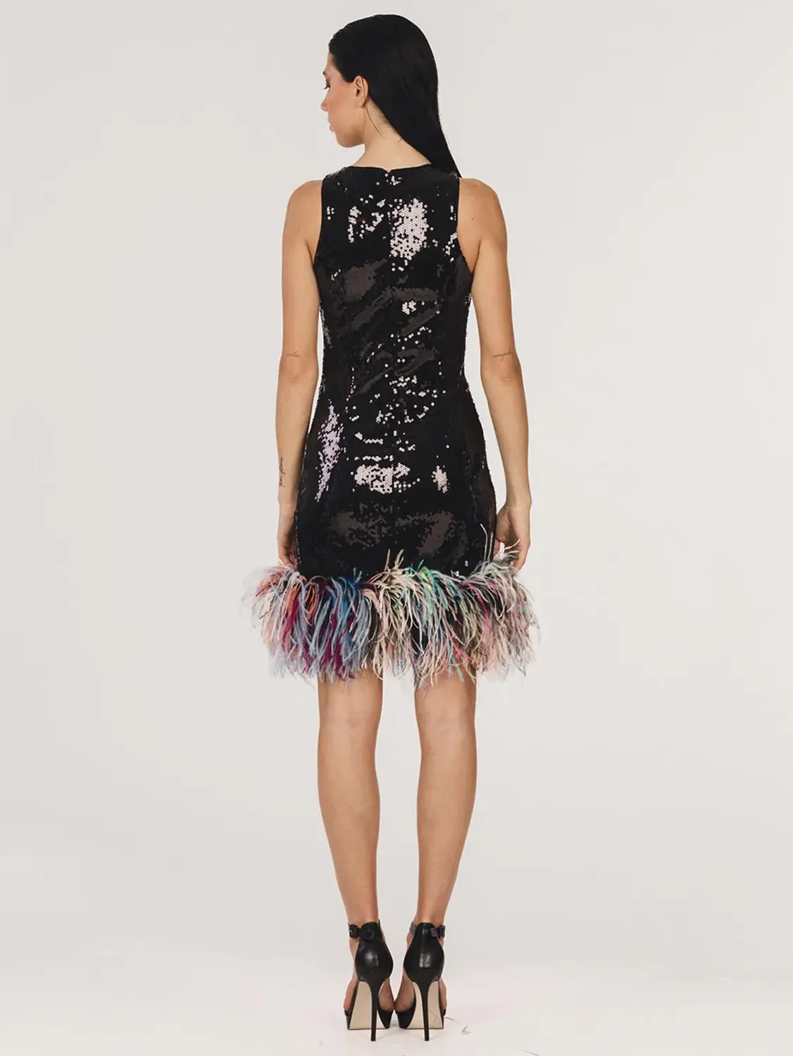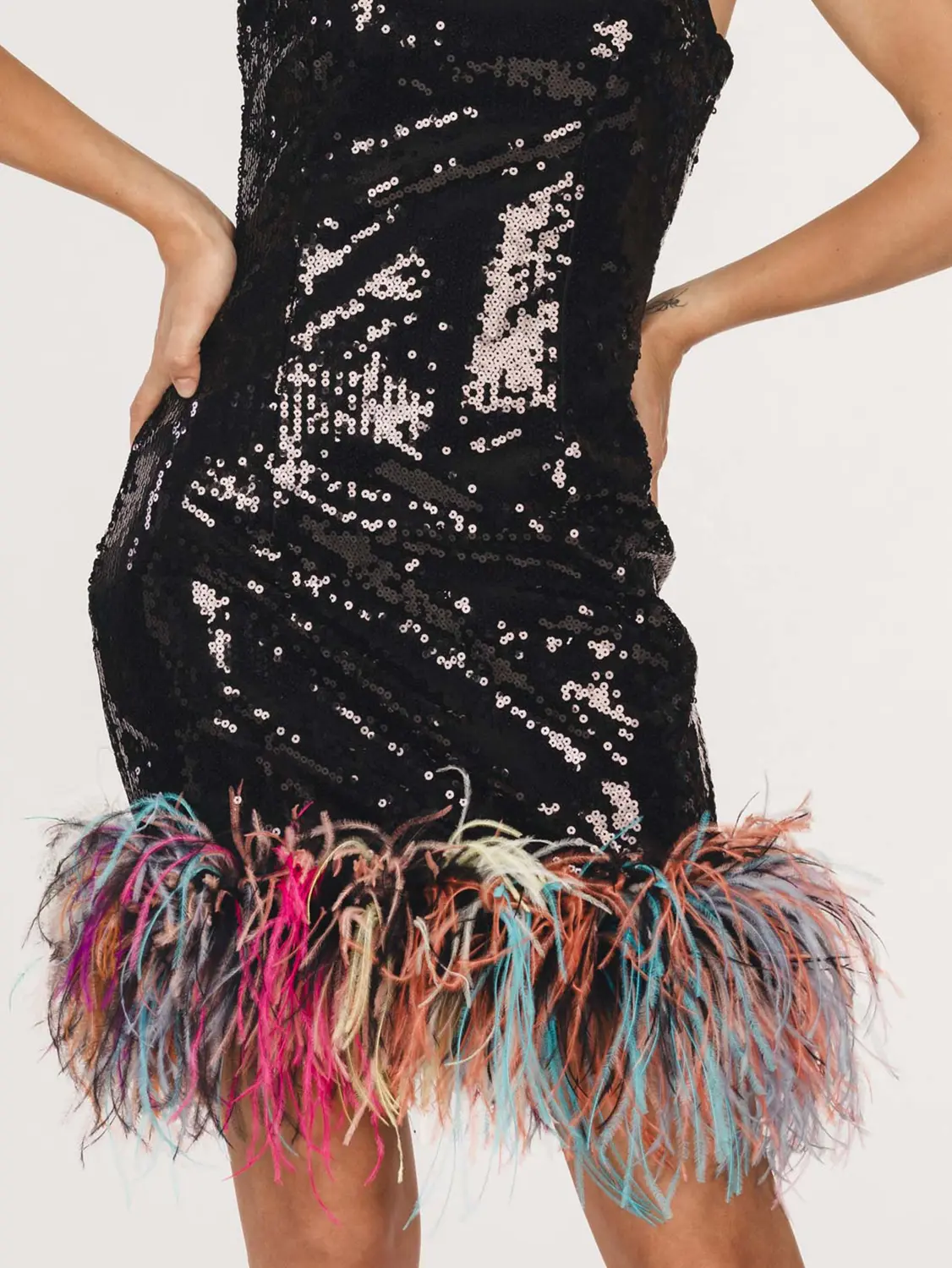 TESSUTO PRINCIPALE: 100% PET – FODERA: 97% poliestere – 3% elastane – Piume di struzzo.