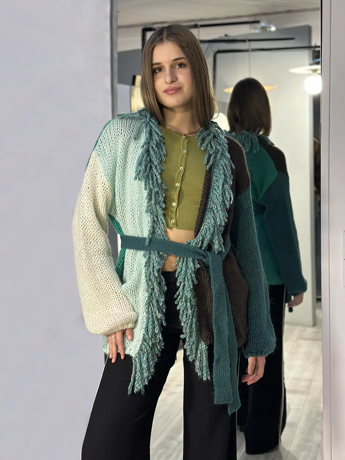 Realizzata in misto alpaca e caratterizzata da un disegno esclusivo, questa giacca presenta collo a scialle impreziosito da una frangia in mohair a contrasto. Le tasche a toppa e il fondo sono evidenziati da un bordo in eco dainetto a contrasto e la cintura sempre in eco dainetto è impreziosita da ricamo punto cavallo con filo di lana a contrasto.