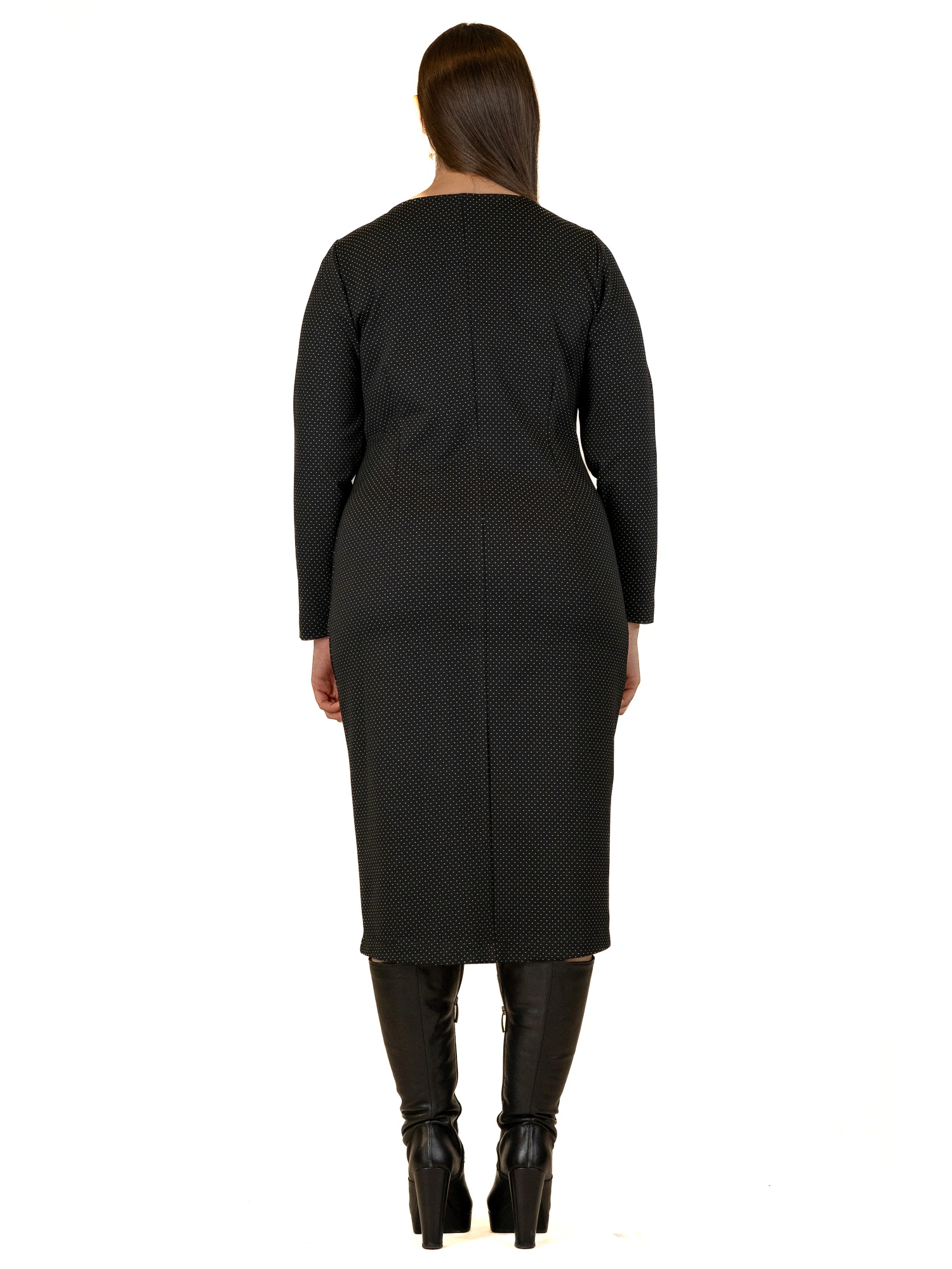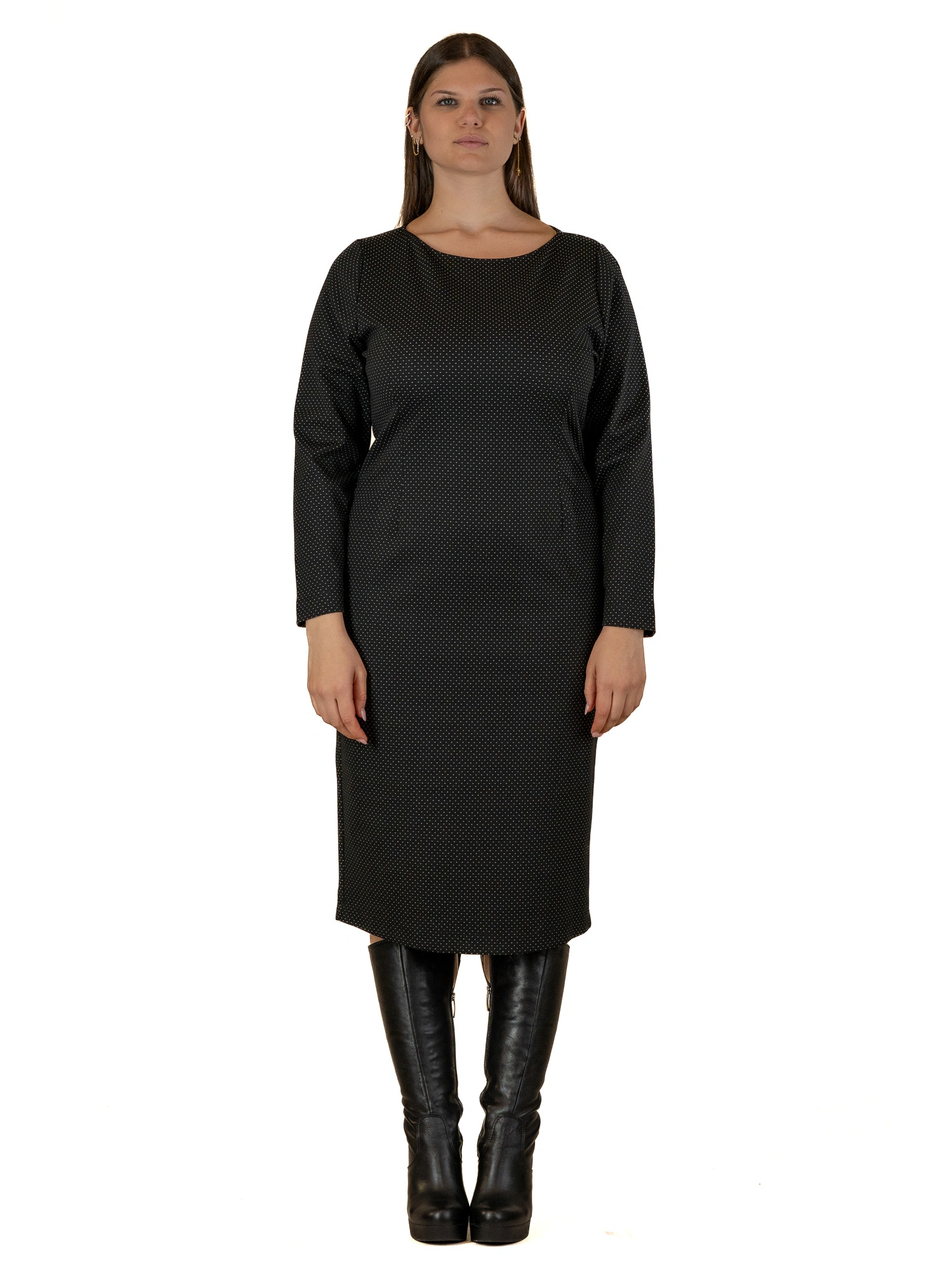 ABITO MIDI DALLA LINEA ESSENZIALE E RAFFINATA, PERFETTO PER VALORIZZARE LA FIGURA CON DISCREZIONE E CLASSE. IL TAGLIO DRITTO, LO SCOLLO ROTONDO E LE MANICHE LUNGHE CREANO UN’ELEGANZA MISURATA, MENTRE IL TESSUTO LEGGERMENTE PUNTINATO DONA UN TOCCO DI DINAMISMO. UN CAPO IDEALE PER OCCASIONI FORMALI O CERIMONIE SOBRIE, DA INDOSSARE DA SOLO O COORDINATO AL GIACCHINO DEL COMPLETO PER UN EFFETTO CHANEL RIVISITATO. LA MODELLA È ALTA 170 CM E INDOSSA UNA TAGLIA M.