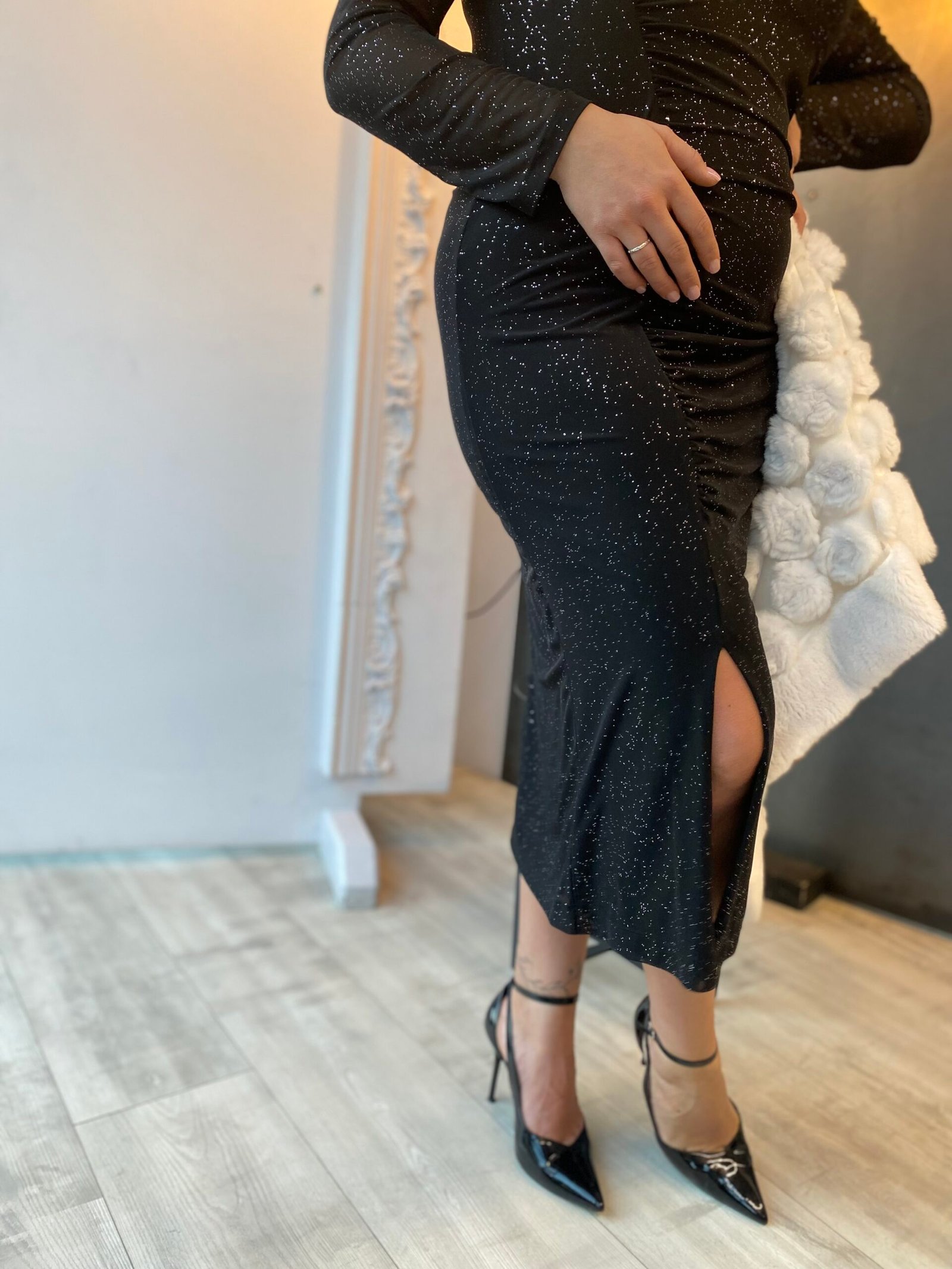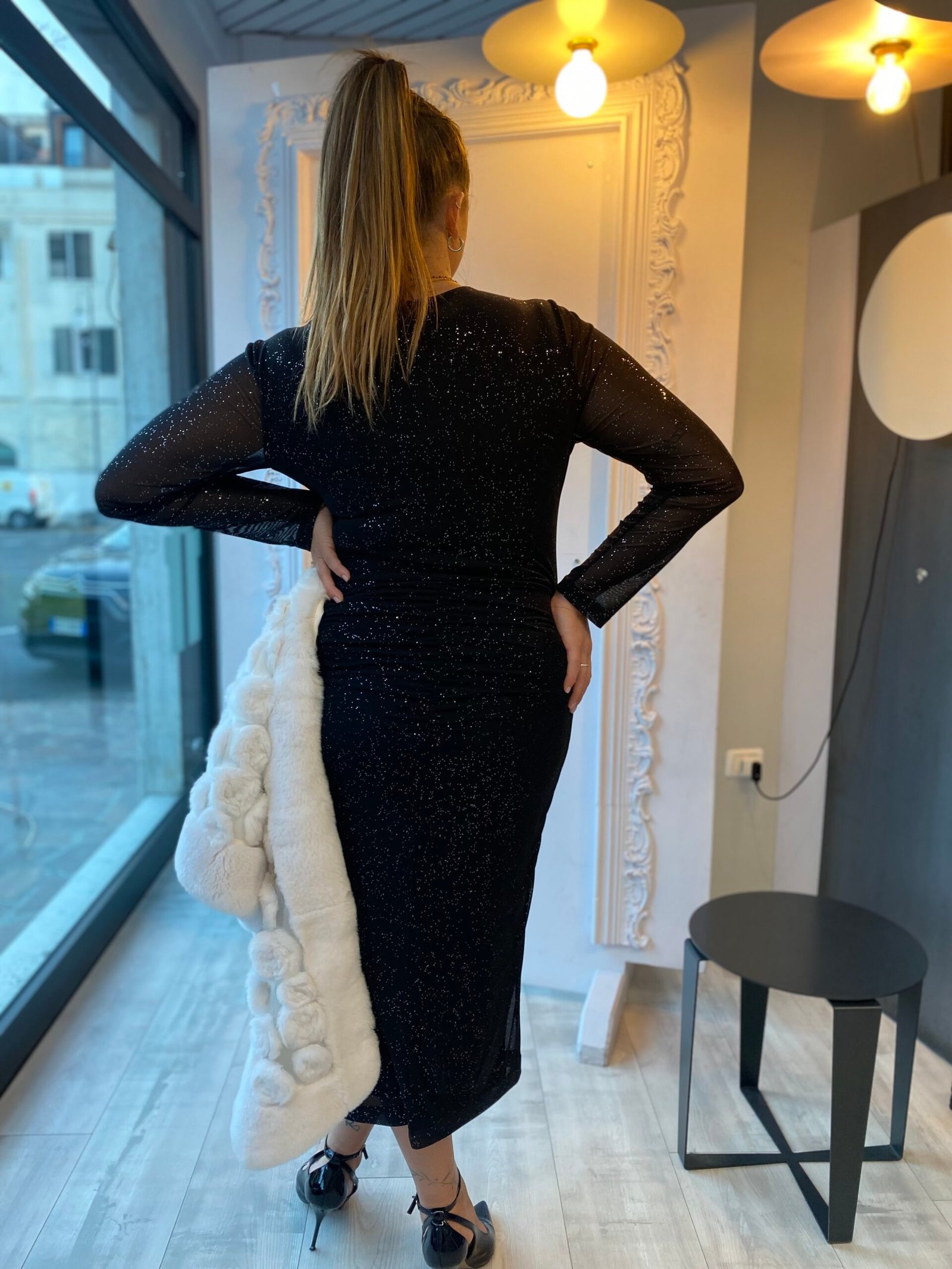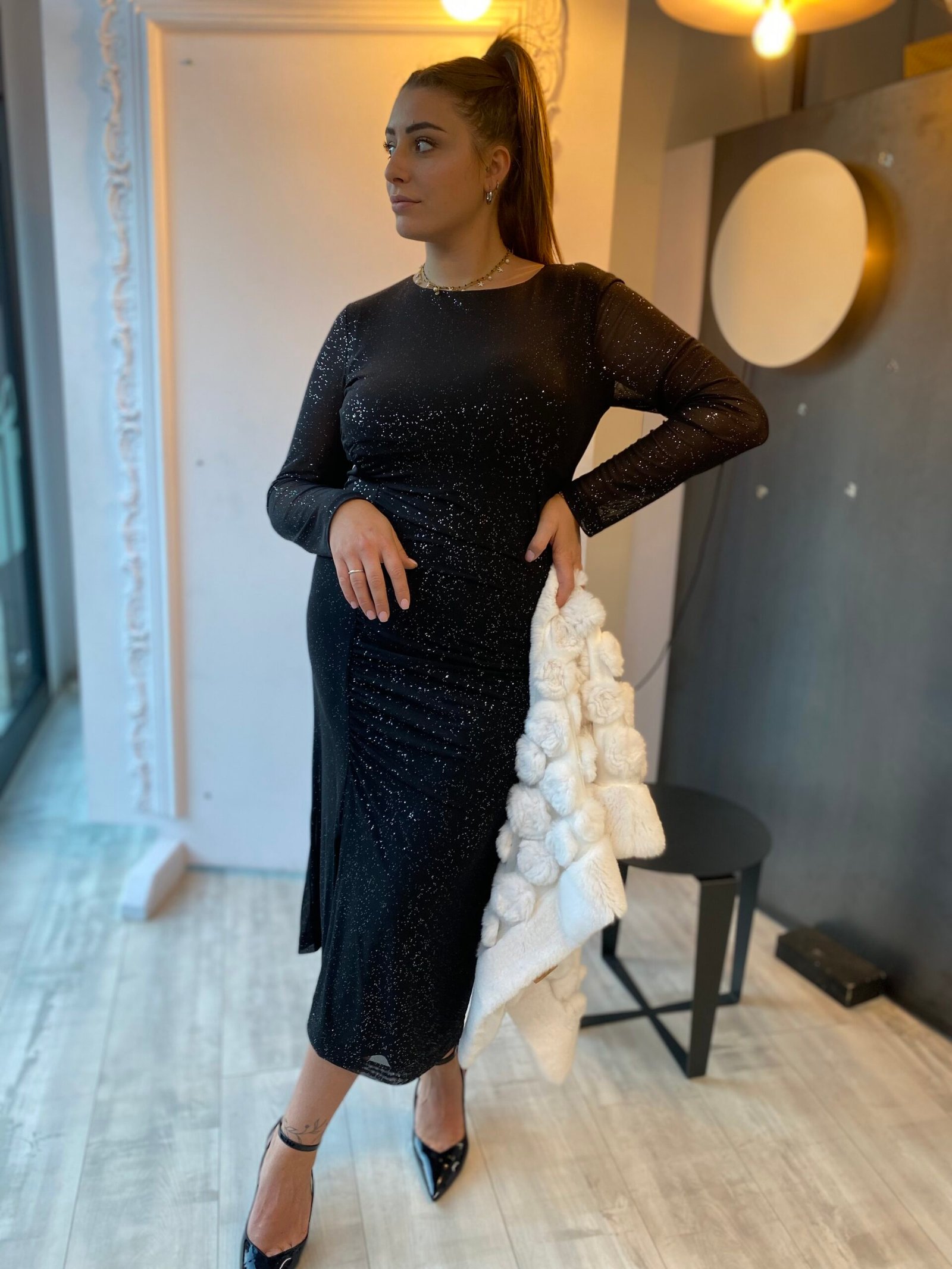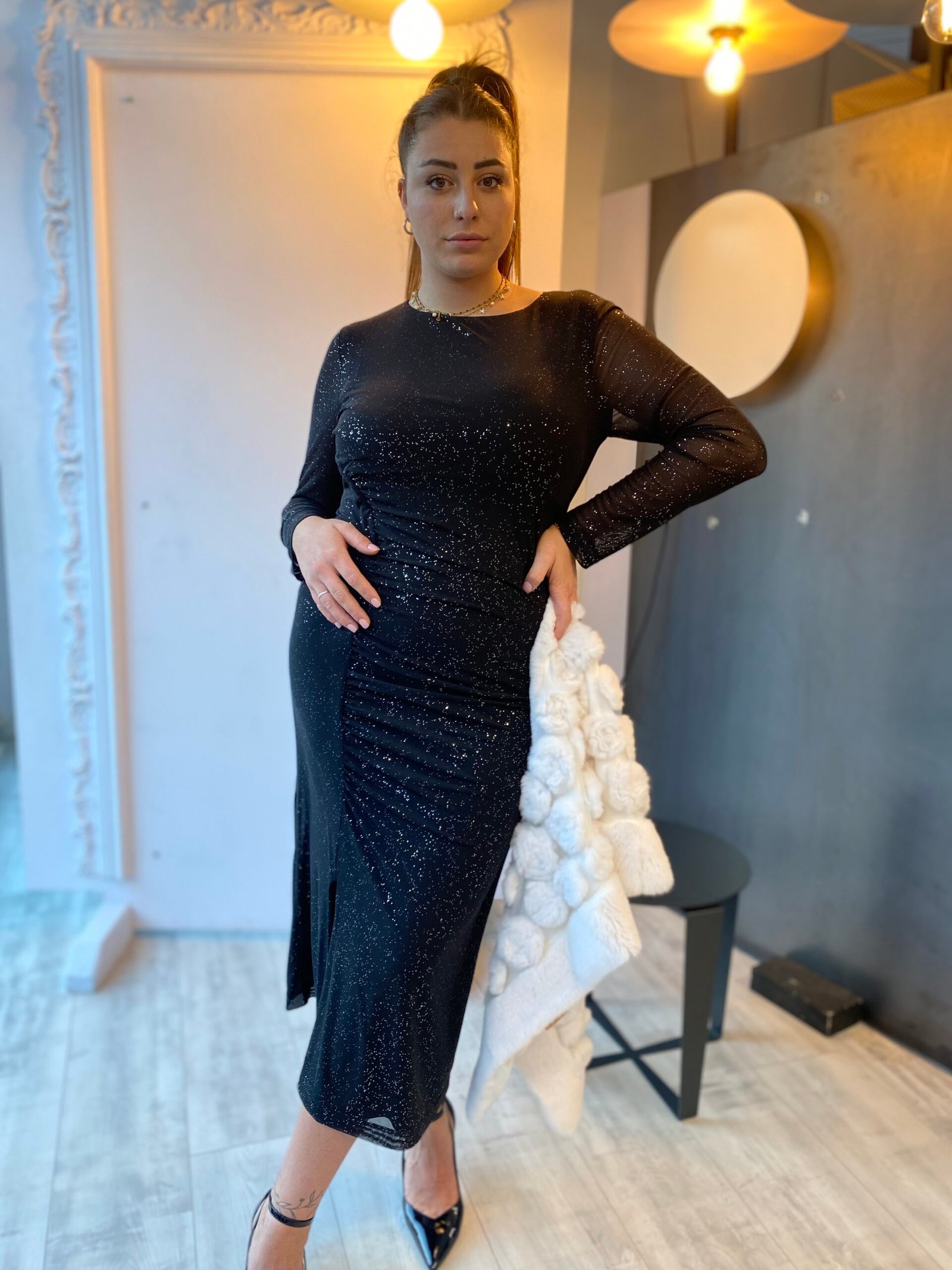 ABITO LUNGO CON MANICA IN TULLE EFFETTO ILLUSION, ARRICCIATO SUL DAVANTI PER UNA VESTIBILITÀ FEMMINILE E SCINTILLANTE. LA LAVORAZIONE LUREX LO RENDE PERFETTO PER CERIMONIE, FESTE E SERATE SPECIALI. SEDUCENTE SENZA ESSERE ECCESSIVO, VALORIZZA LE CURVE CON ELEGANZA E SICUREZZA. LA MODELLA È ALTA 180 CM E INDOSSA UNA TAGLIA M.