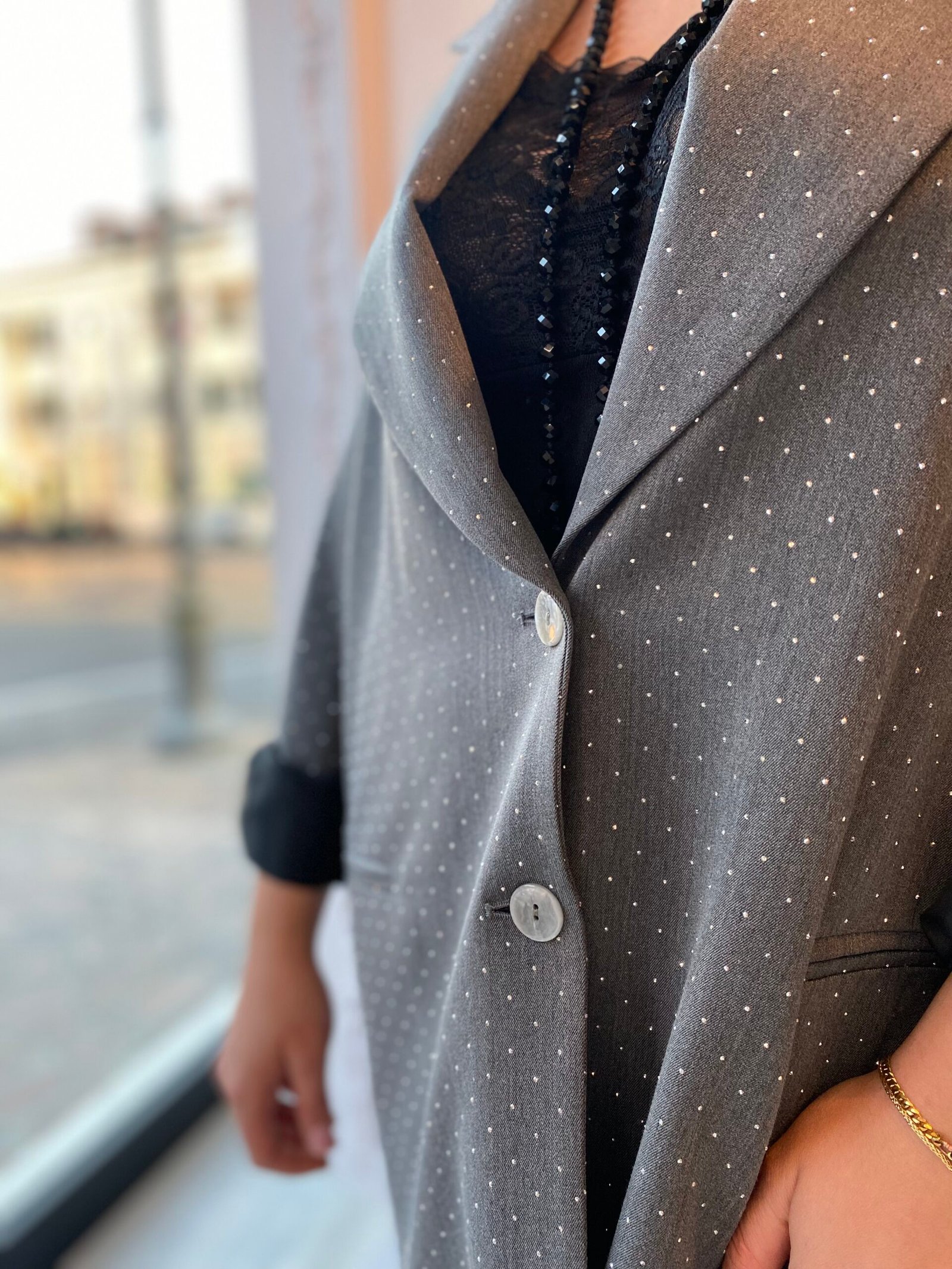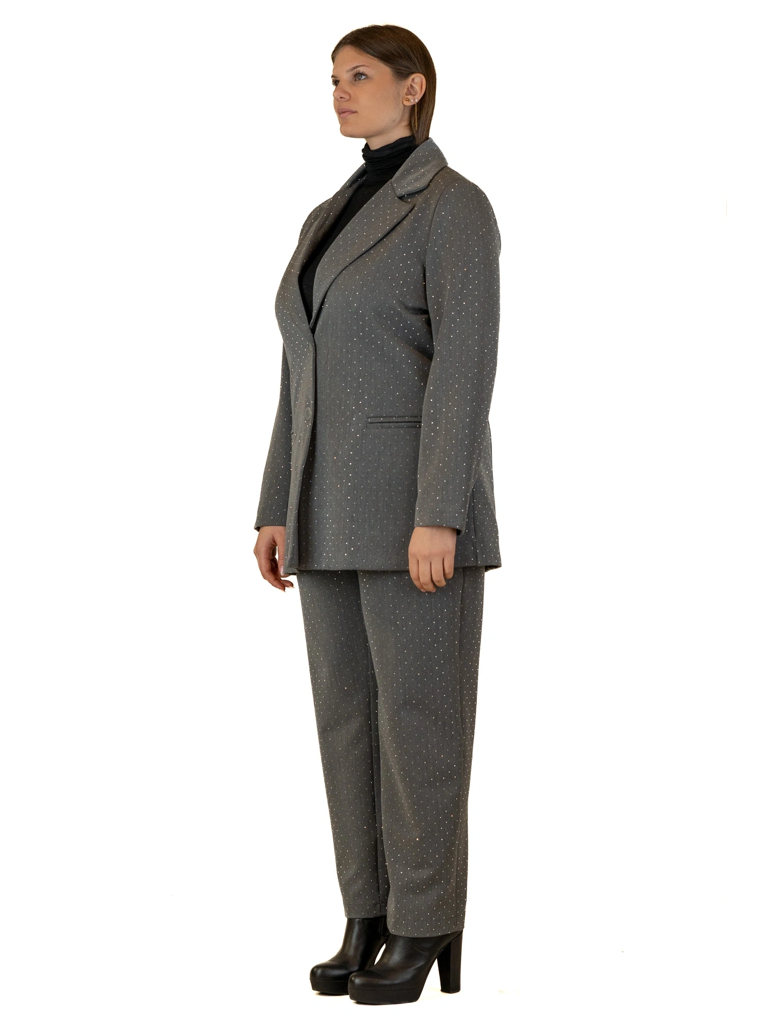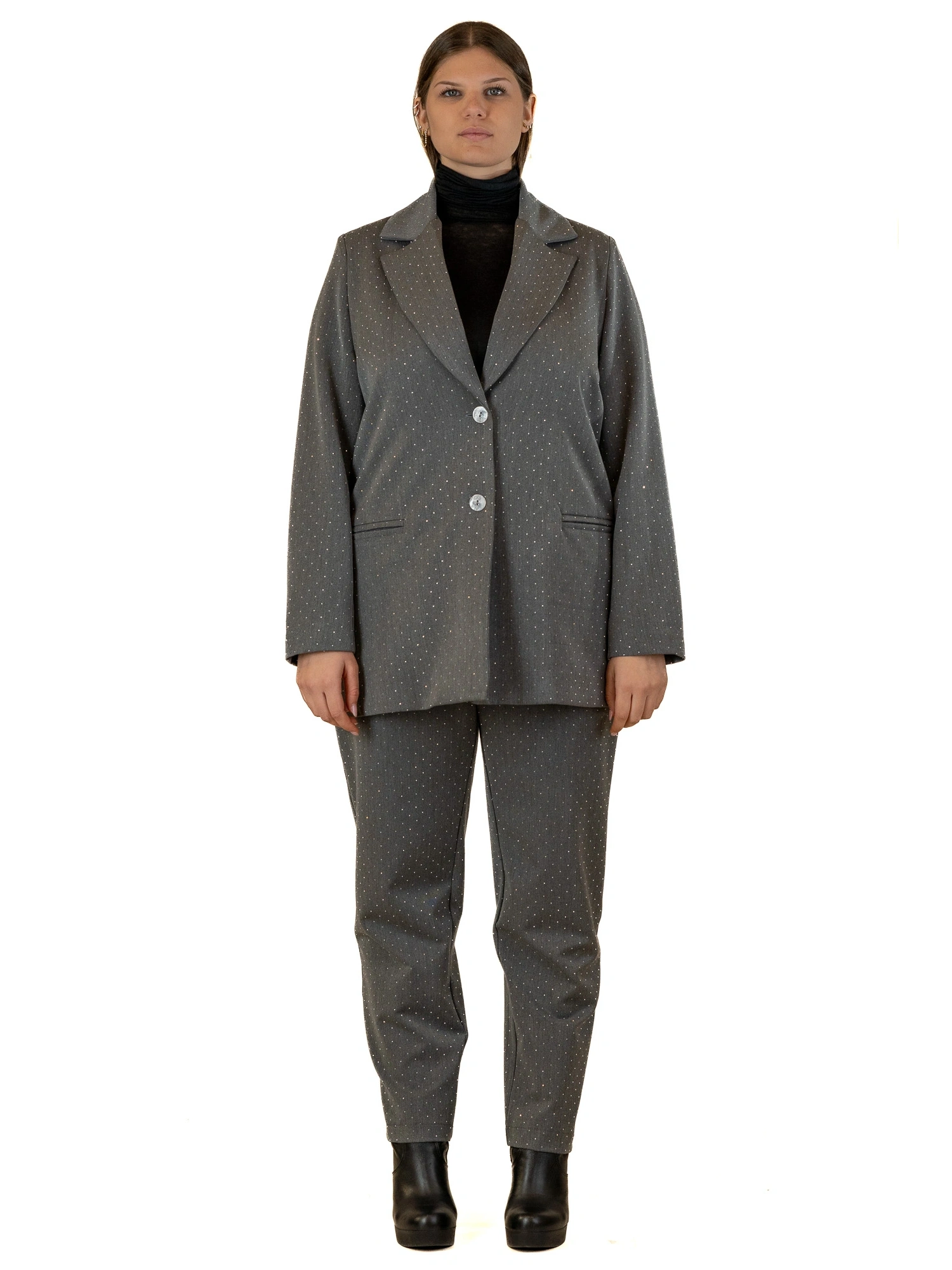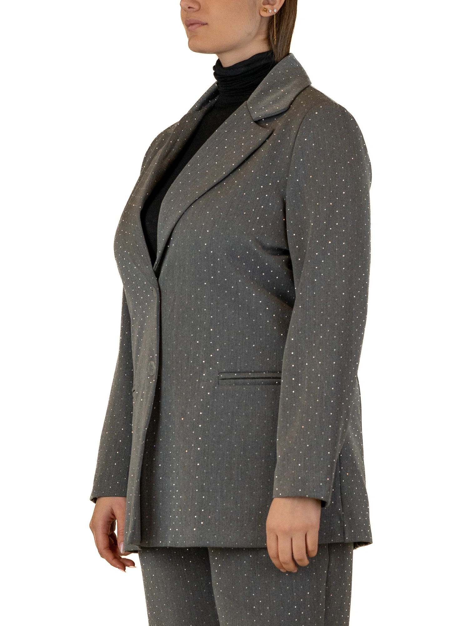 GIACCA DALLA LINEA PULITA MA CON UN TOCCO DI LUCE: I MICRO STRASS DISCRETI E LUMINOSI LA TRASFORMANO IN UN CAPO PERFETTO PER I MOMENTI SPECIALI O PER RENDERE UNICO IL TUO LOOK QUOTIDIANO. INDOSSALA CON IL PANTALONE COORDINATO PER UN EFFETTO TAILLEUR MODERNO.