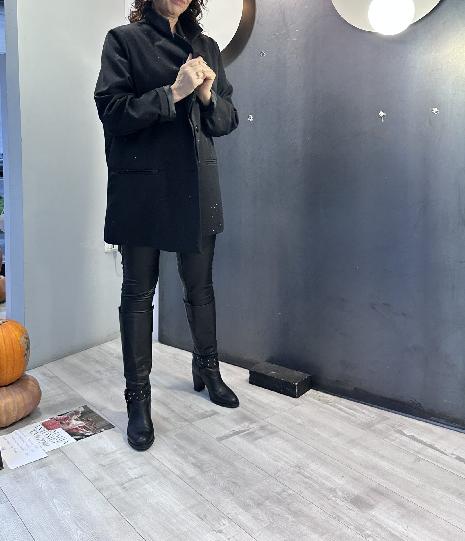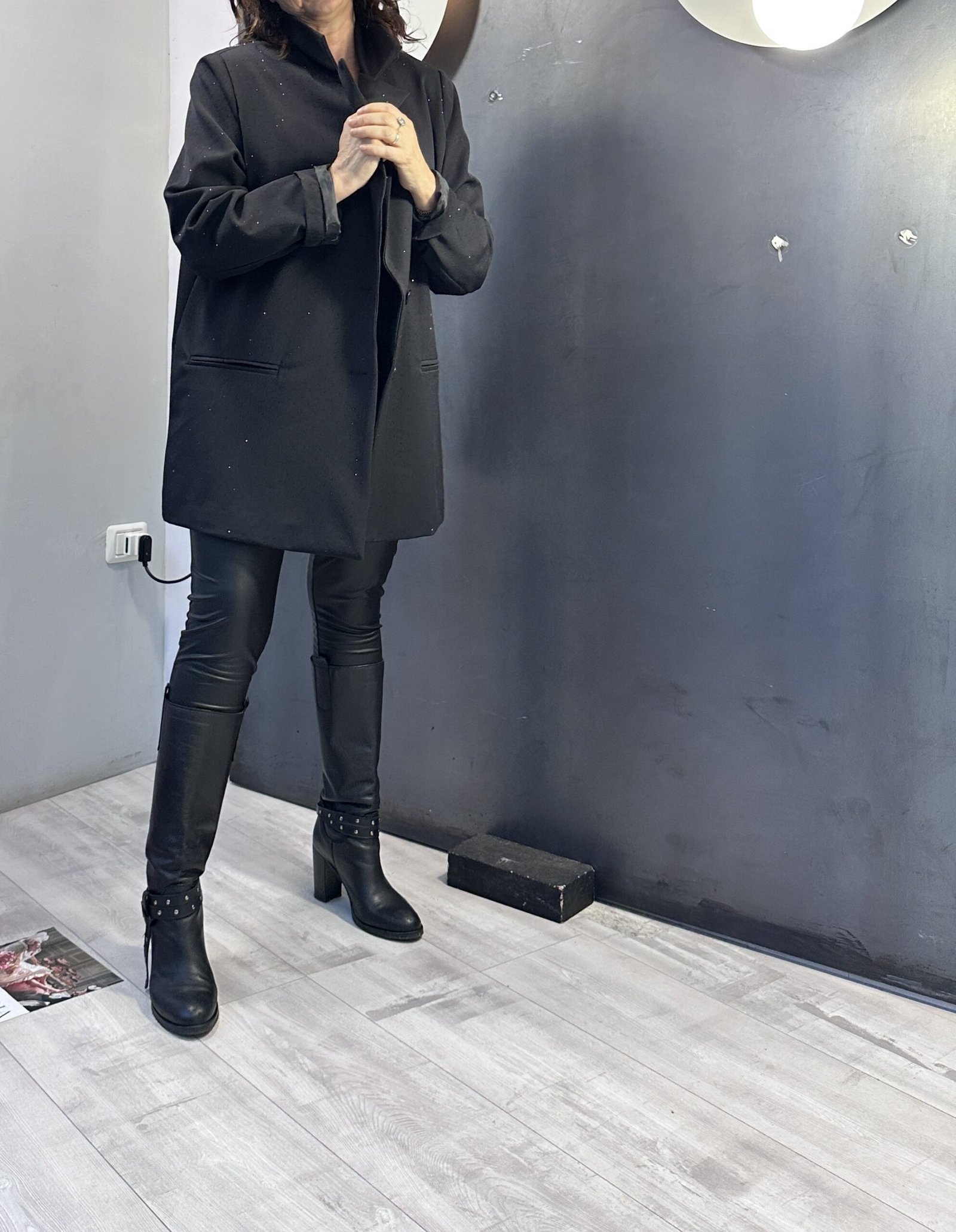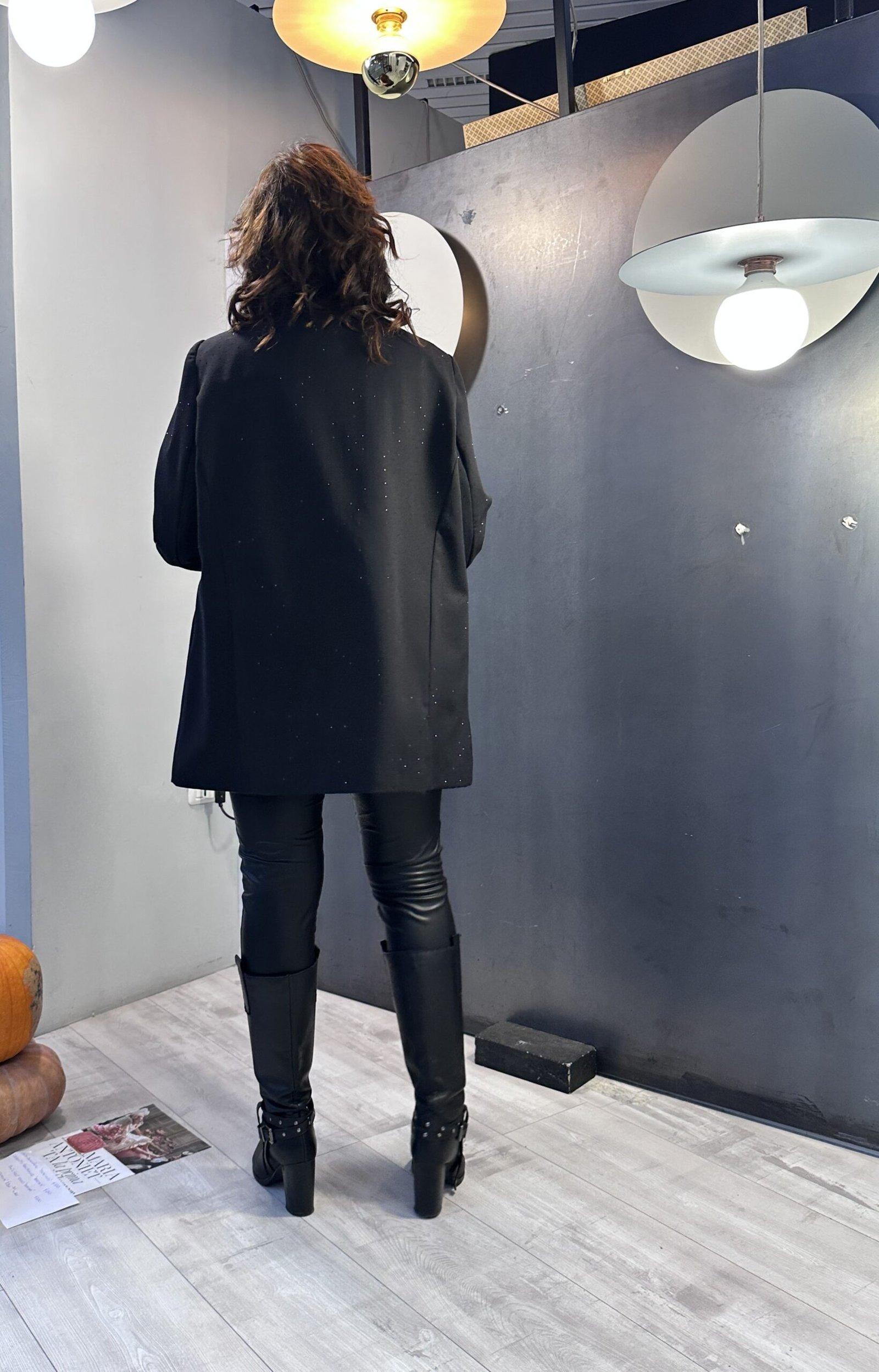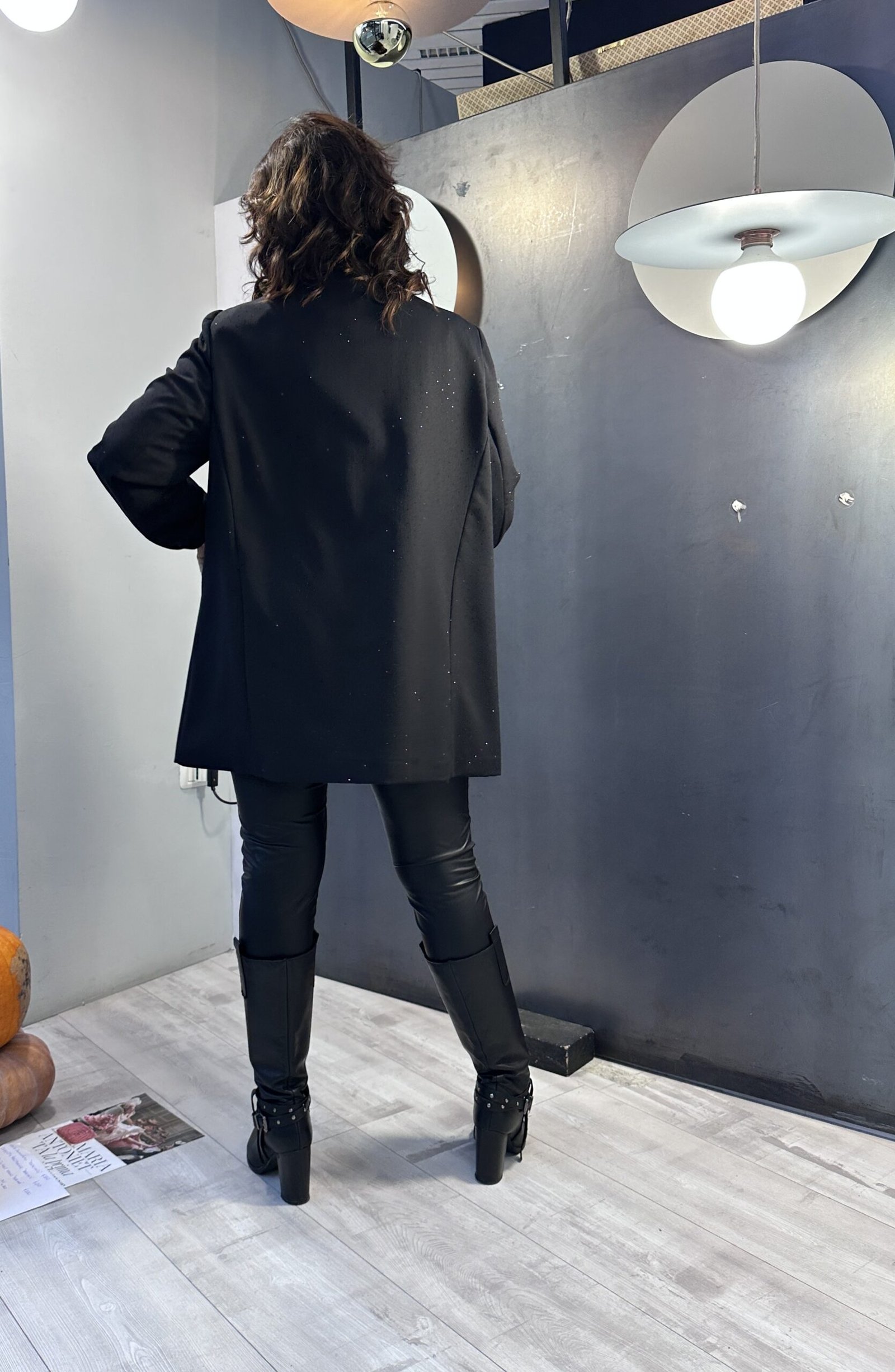 GIACCA DALLA LINEA PULITA MA CON UN TOCCO DI LUCE: I MICRO STRASS DISCRETI E LUMINOSI LA TRASFORMANO IN UN CAPO PERFETTO PER I MOMENTI SPECIALI O PER RENDERE UNICO IL TUO LOOK QUOTIDIANO. INDOSSALA CON IL PANTALONE COORDINATO PER UN EFFETTO TAILLEUR MODERNO.