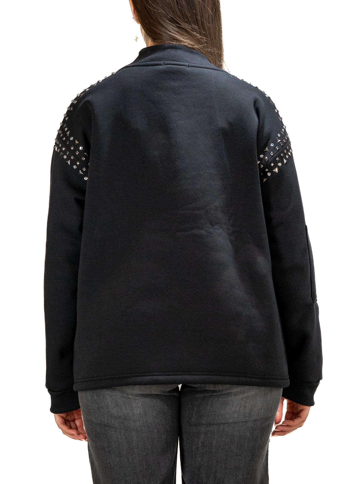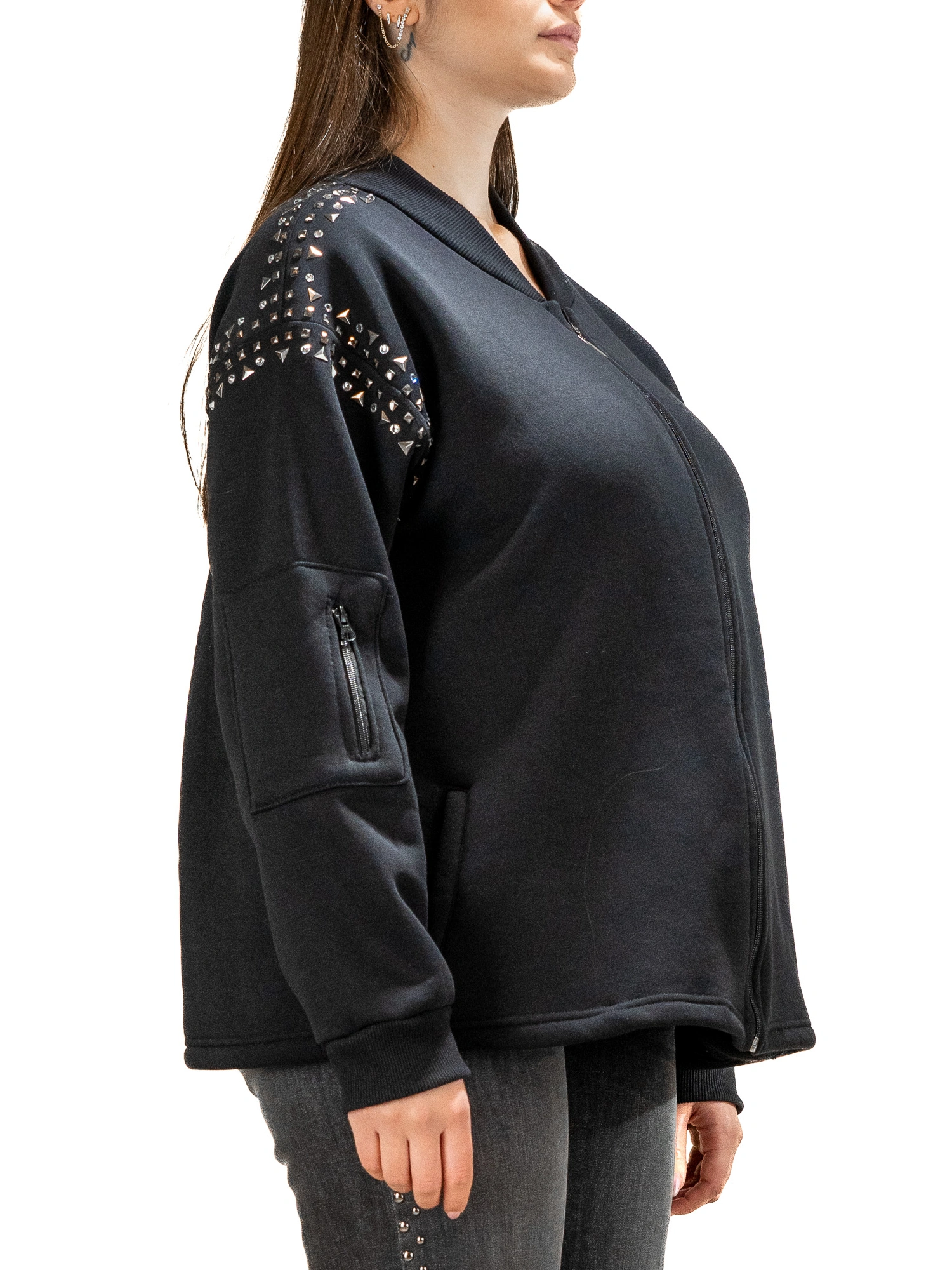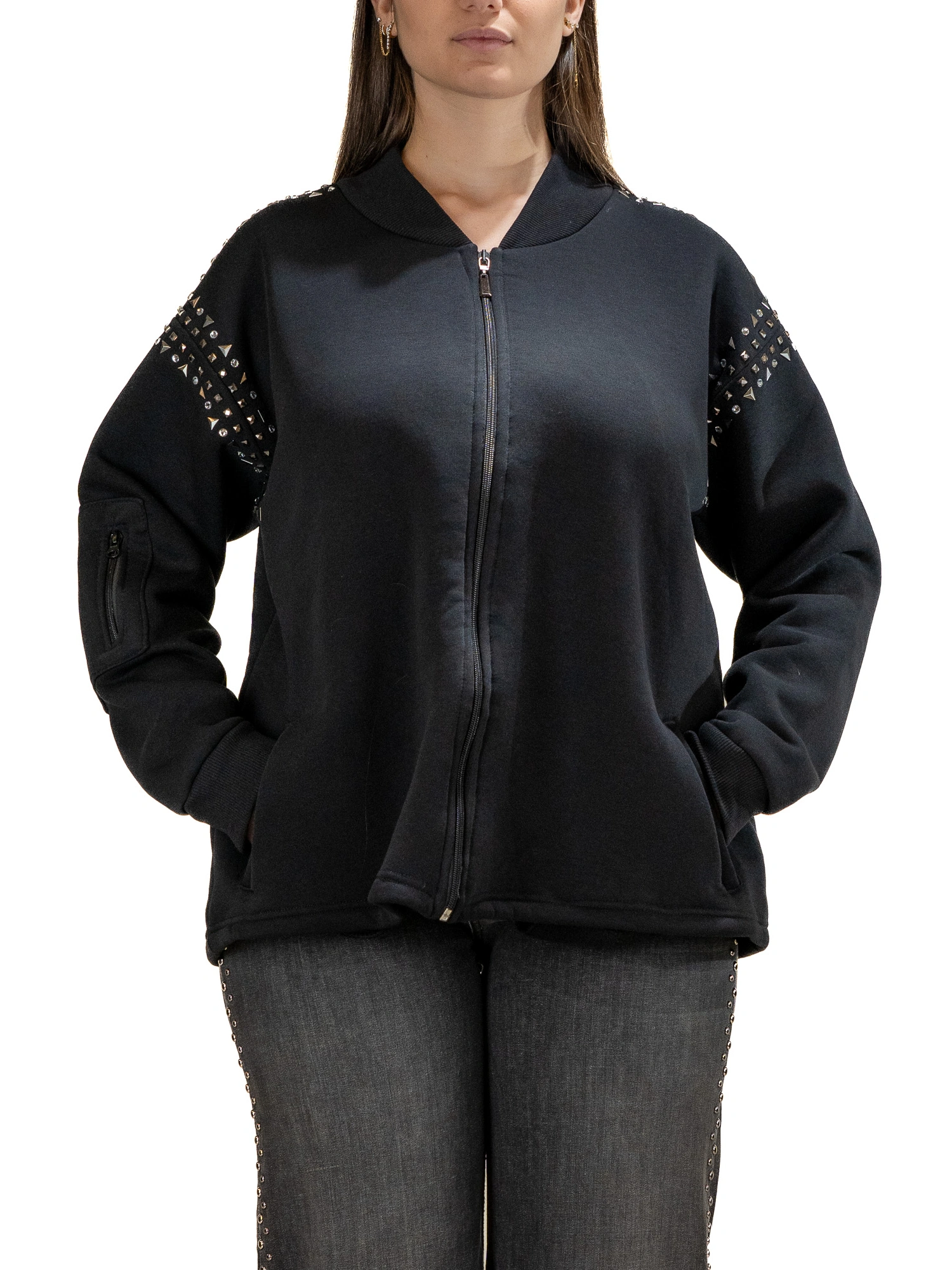 FELPA A BOMBER IN COTONE CON ZIP CON COLLO BOMBATO E DETTAGLI DI BORCHIE SU SPALLE E MANICHE. TASCA CON ZIP SUL BRACCIO E VESTIBILITÀ MORBIDA PER UN LOOK GRINTOSO, DALL’ANIMA URBANA E CONTEMPORANEA. LA MODELLA È ALTA 170 CM E INDOSSA UNA TAGLIA M.