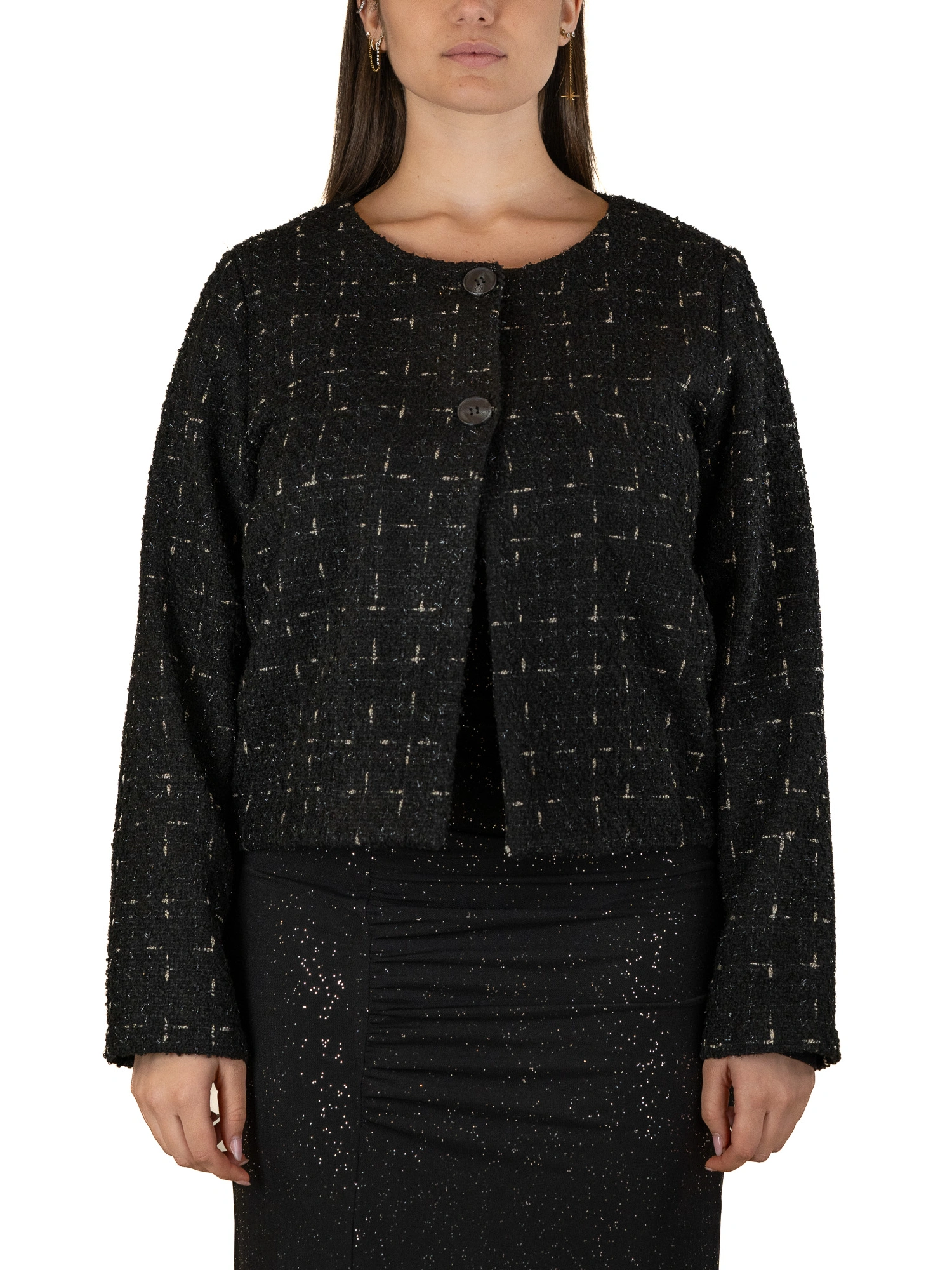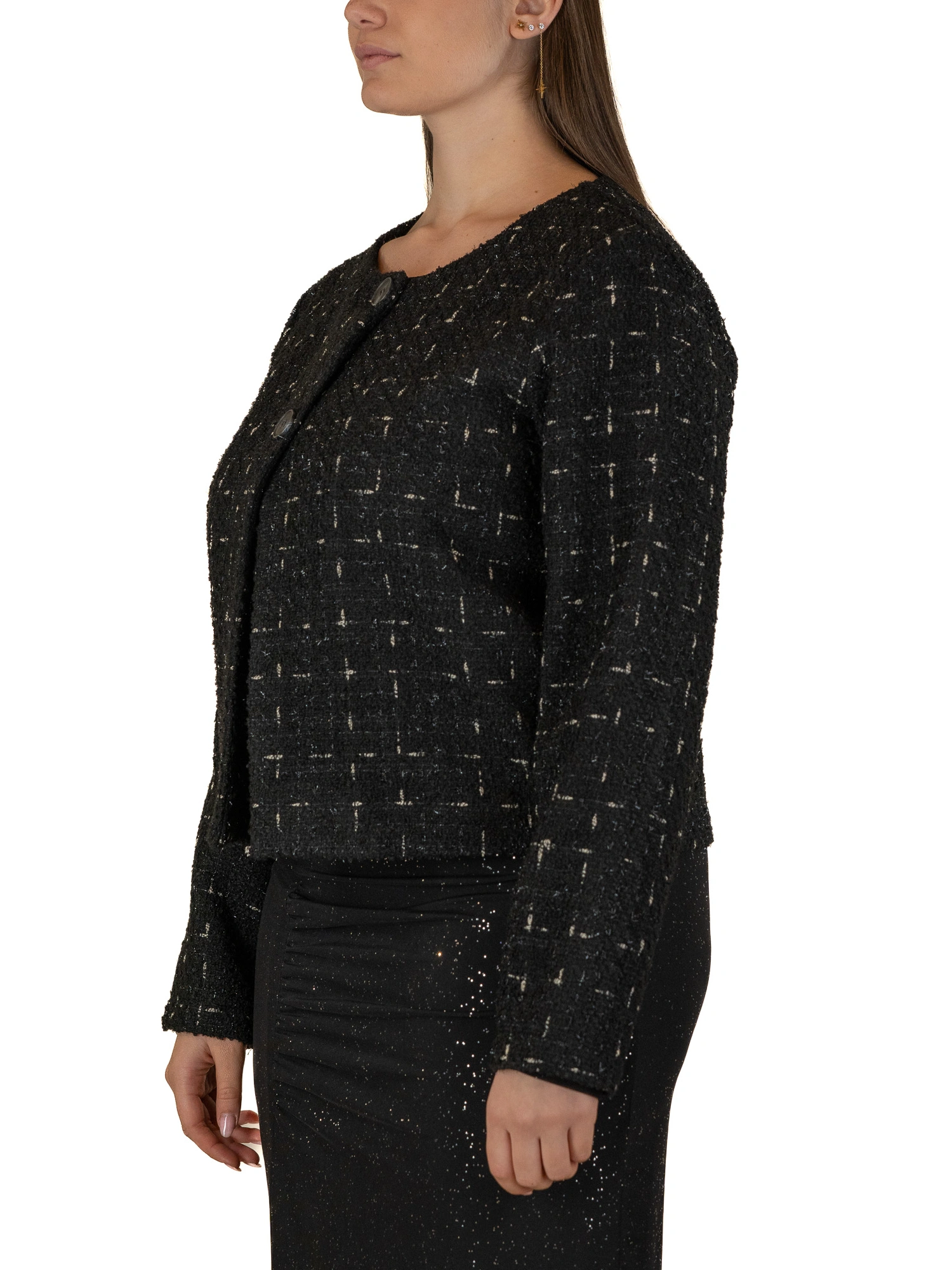 GIACCA CORTA ISPIRATA ALLO STILE ICONICO DI CHANEL, REALIZZATA IN TWEED CON LAVORAZIONE RAFFINATA E BOTTONI DECORATIVI. UN CAPO SENZA TEMPO CHE UNISCE ELEGANZA, FEMMINILITÀ E TOCCO CONTEMPORANEO. PERFETTA PER COMPLETARE LOOK DA GIORNO O DA SERA CON CLASSE. LA MODELLA È ALTA 170 CM E INDOSSA UNA TAGLIA M.