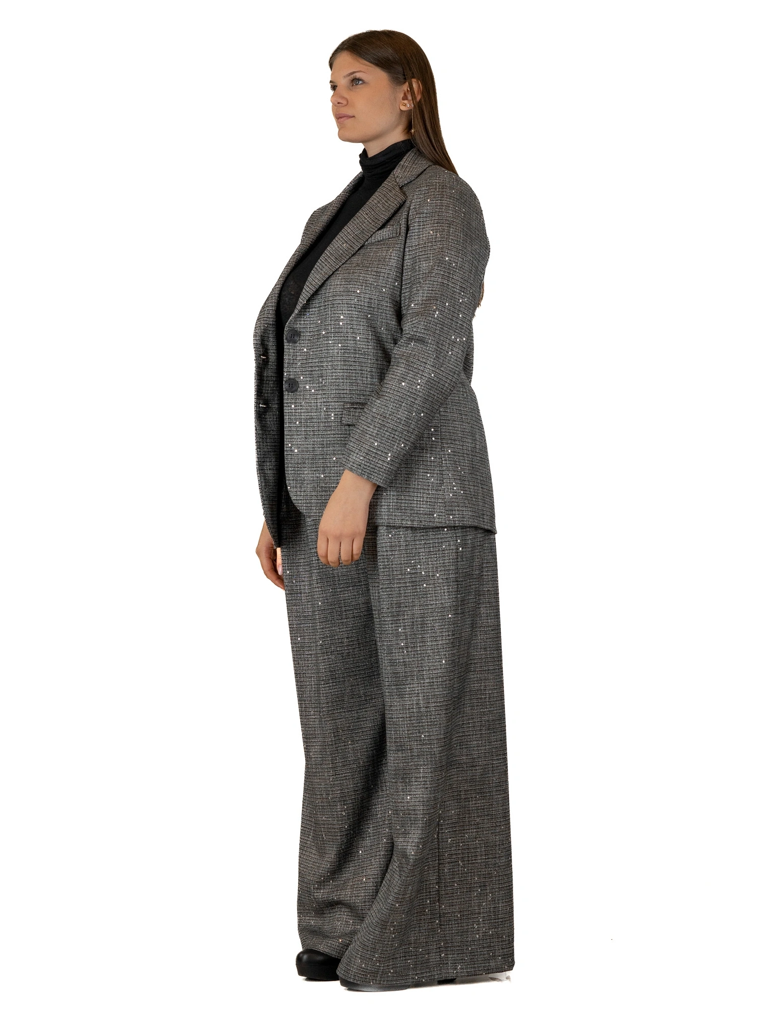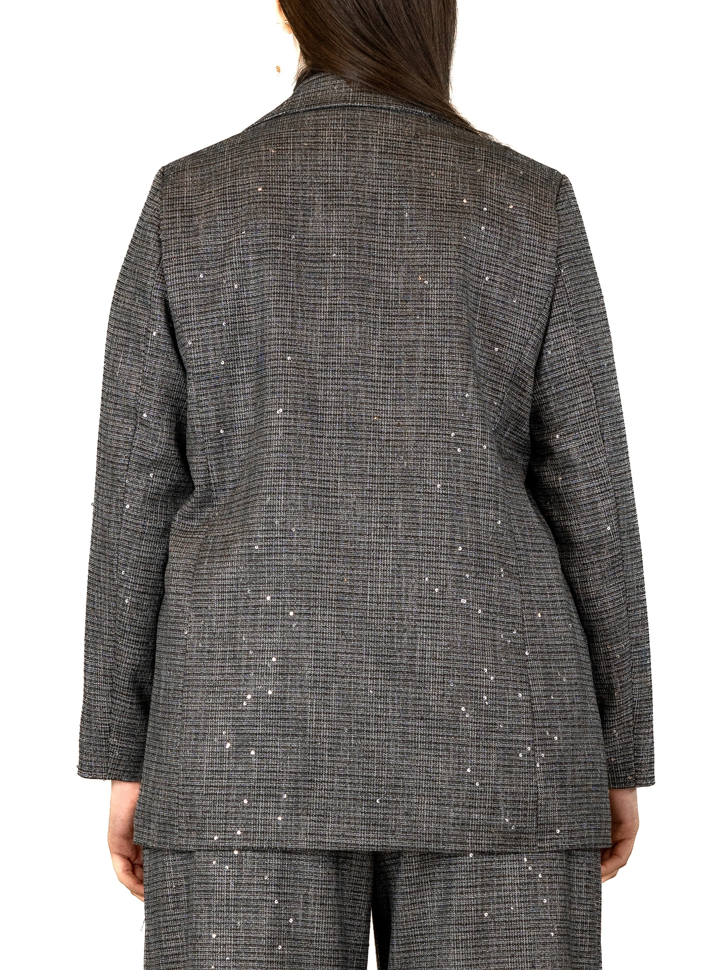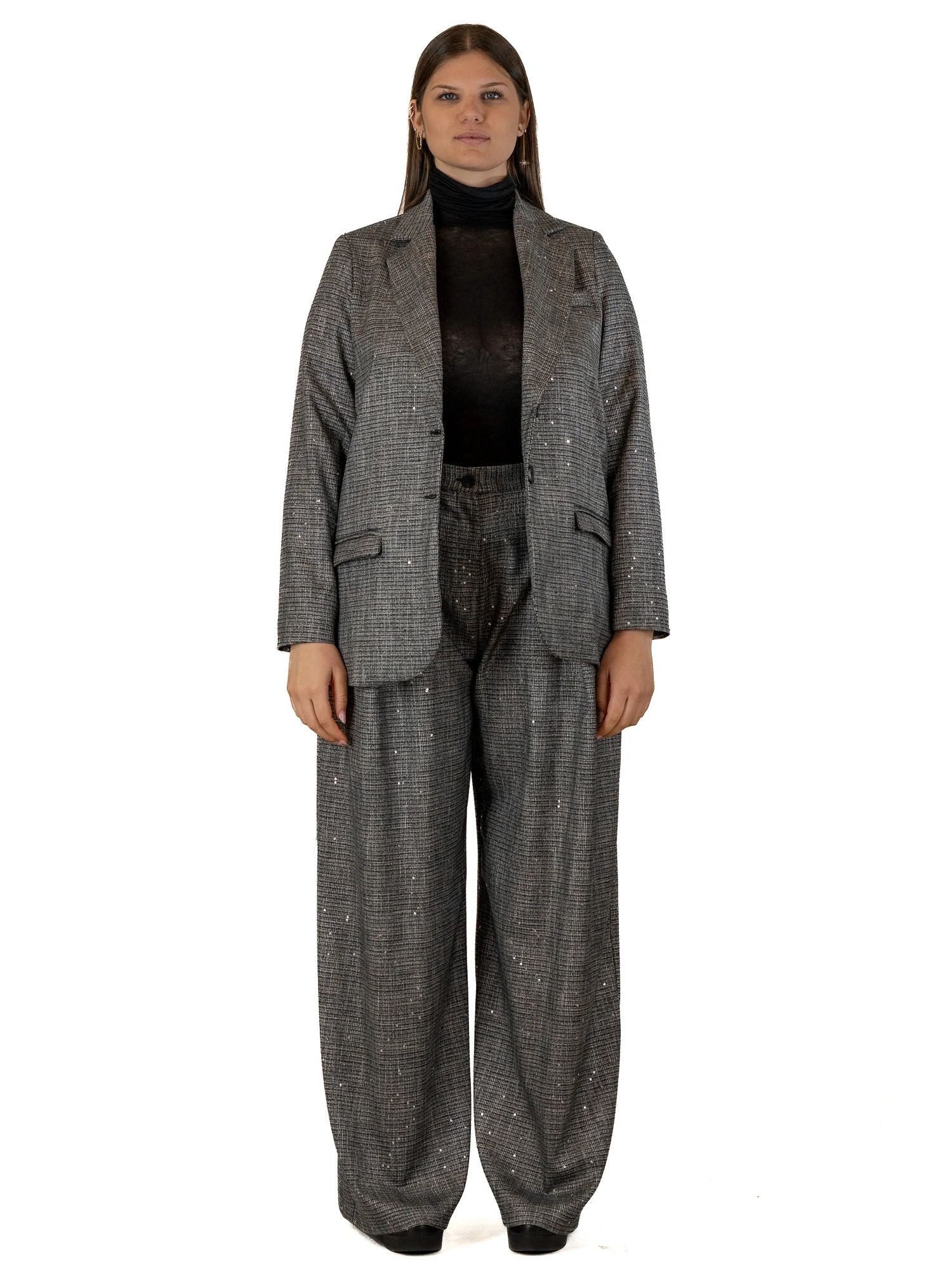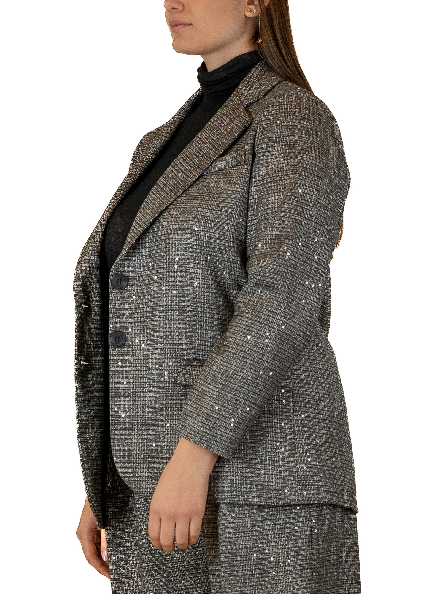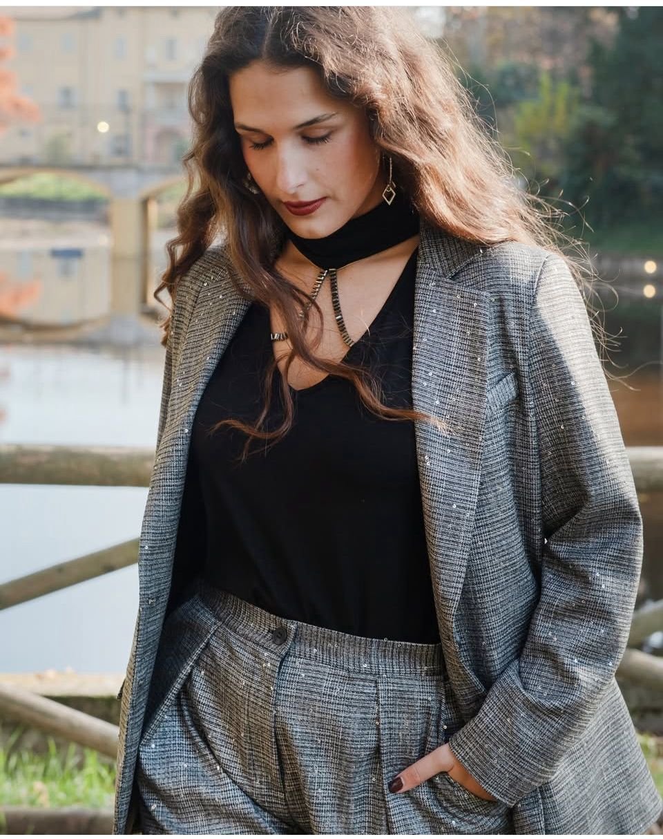 GIACCA CON PAILLETTES UN CAPO CHE UNISCE RAFFINATEZZA CLASSICA E DETTAGLI BRILLANTI: QUESTA GIACCA È L’EMBLEMA DI UN’ELEGANZA RICERCATA DAL TOCCO MODERNO. IL TAGLIO MASCULINO VIENE ADDOLCITO DA MICRO PAILLETTES DISCRETE MA LUMINOSE, CHE CATTURANO LA LUCE AD OGNI MOVIMENTO. PERFETTA PER COMPLETARE UN LOOK DA OCCASIONE O PER DARE UN ACCENTO SPECIALE ALL’ABBIGLIAMENTO QUOTIDIANO. LA MODELLA È ALTA 170 CM E INDOSSA UNA TAGLIA M.