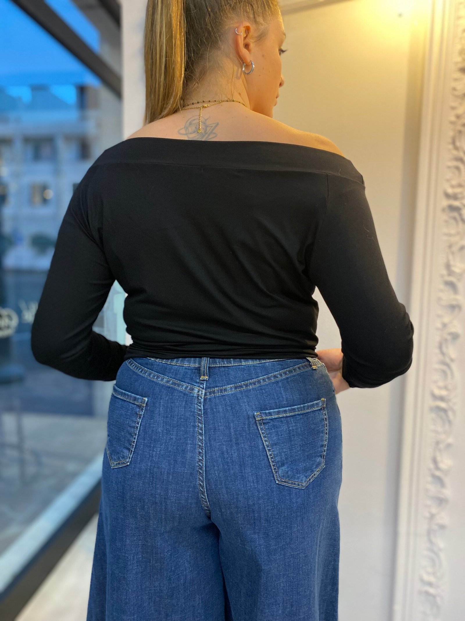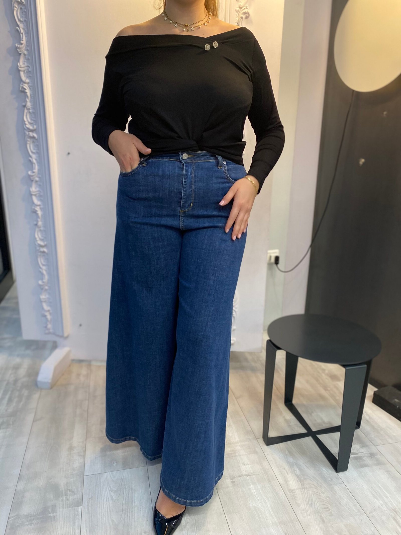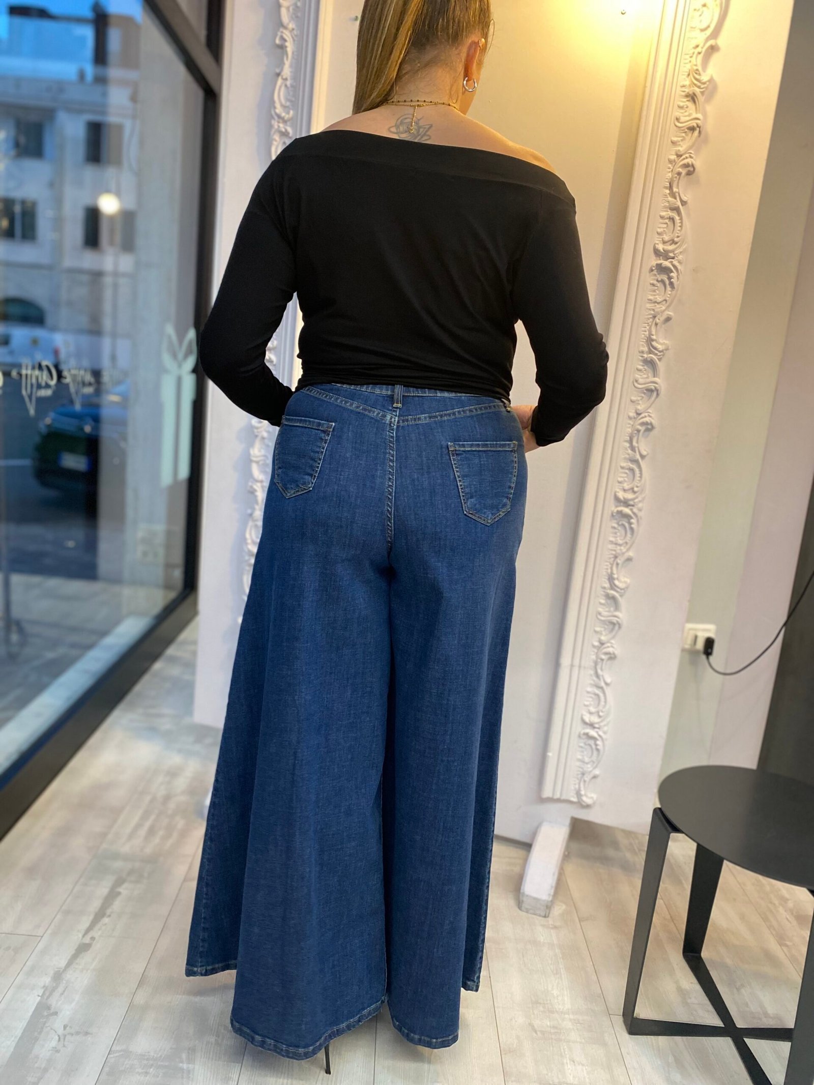 JEANS PALAZZO DAL FIT AMPIO E SCIVOLATO, PERFETTO PER UN LOOK DALL’ALLURE RETRÒ MA DECISAMENTE MODERNA. LA LINEA FLUIDA DONA SLANCIO ALLA FIGURA, MENTRE LA VESTIBILITÀ COMODA ACCOMPAGNA OGNI TUO MOVIMENTO. UN CAPO ICONICO, CHE UNISCE STILE E COMFORT IN UN ABBINAMENTO VERSATILE E SEMPRE ATTUALE. LA MODELLA È ALTA 170 CM E INDOSSA UNA TAGLIA 48.
