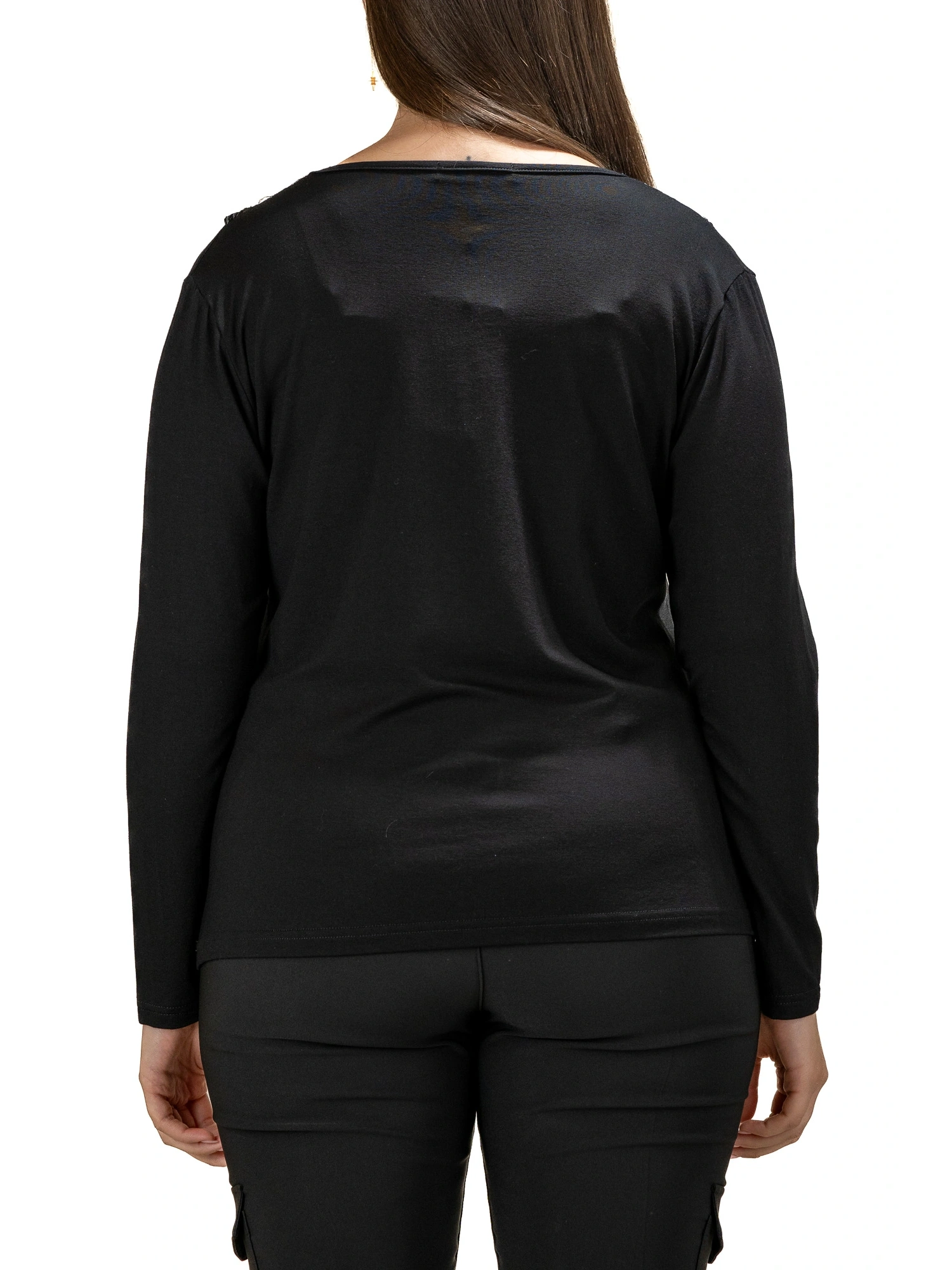 MAGLIA IN VISCOSA STRETCH A MANICA LUNGA CON SCOLLO A V RIFINITO DA IMPORTANTE INSERTO IN PIZZO RICAMATO CON APPLICAZIONI LUCENTI. UN DETTAGLIO ROMANTICO CHE RENDE IL CAPO ELEGANTE E FEMMINILE, PERFETTO ANCHE PER OCCASIONI PIÙ RAFFINATE. LA MODELLA È ALTA 170 CM E INDOSSA UNA TAGLIA M.