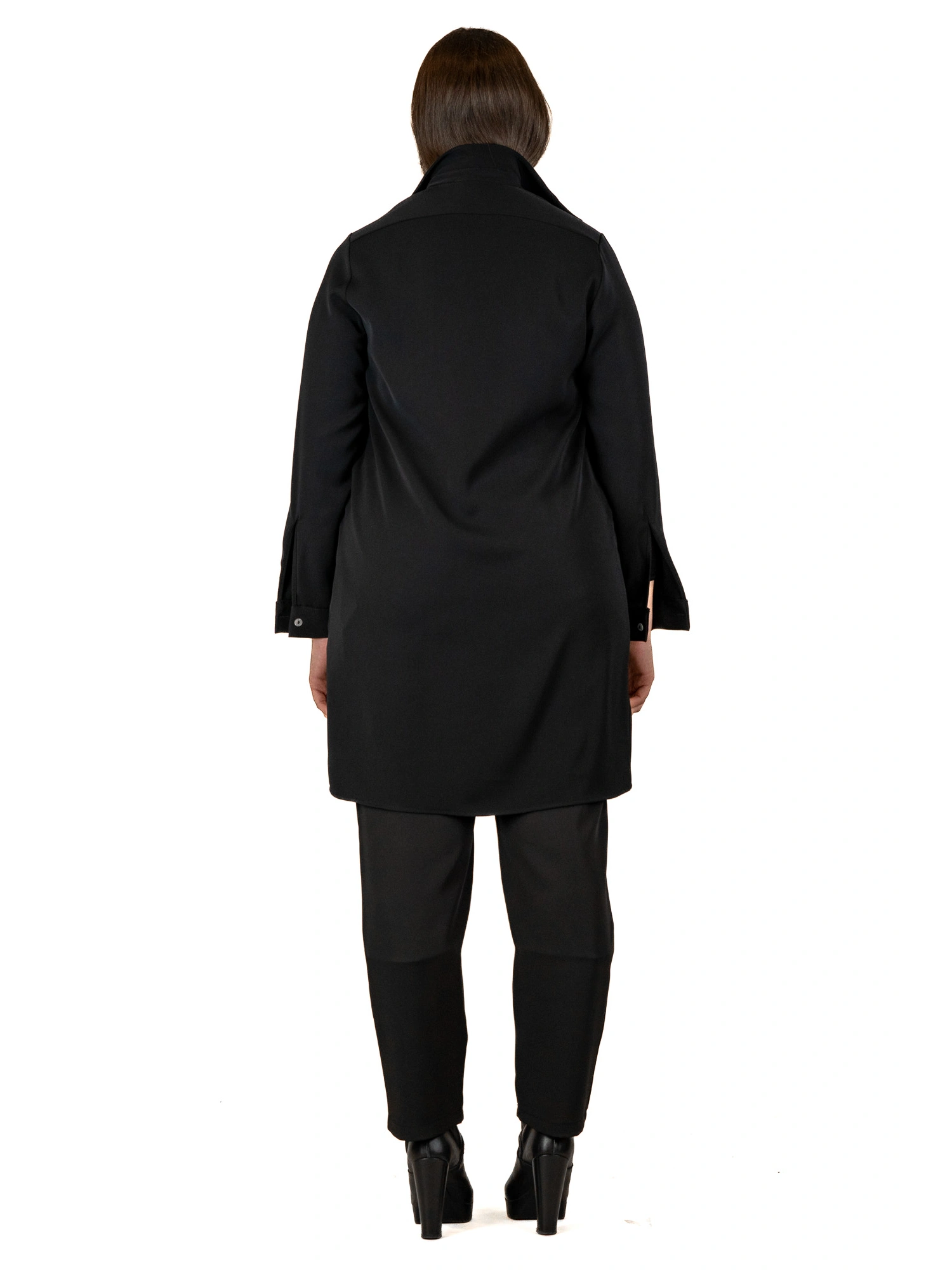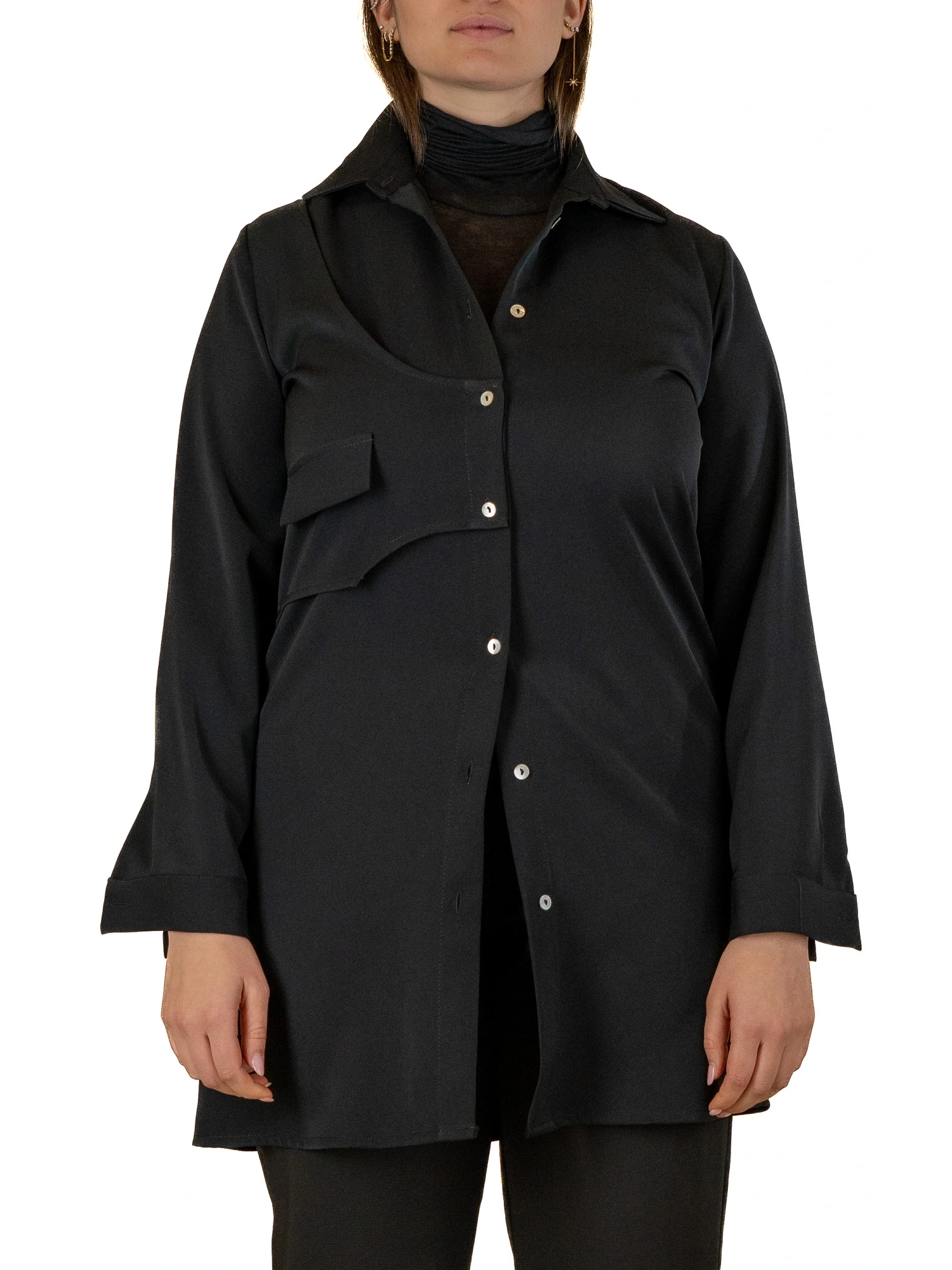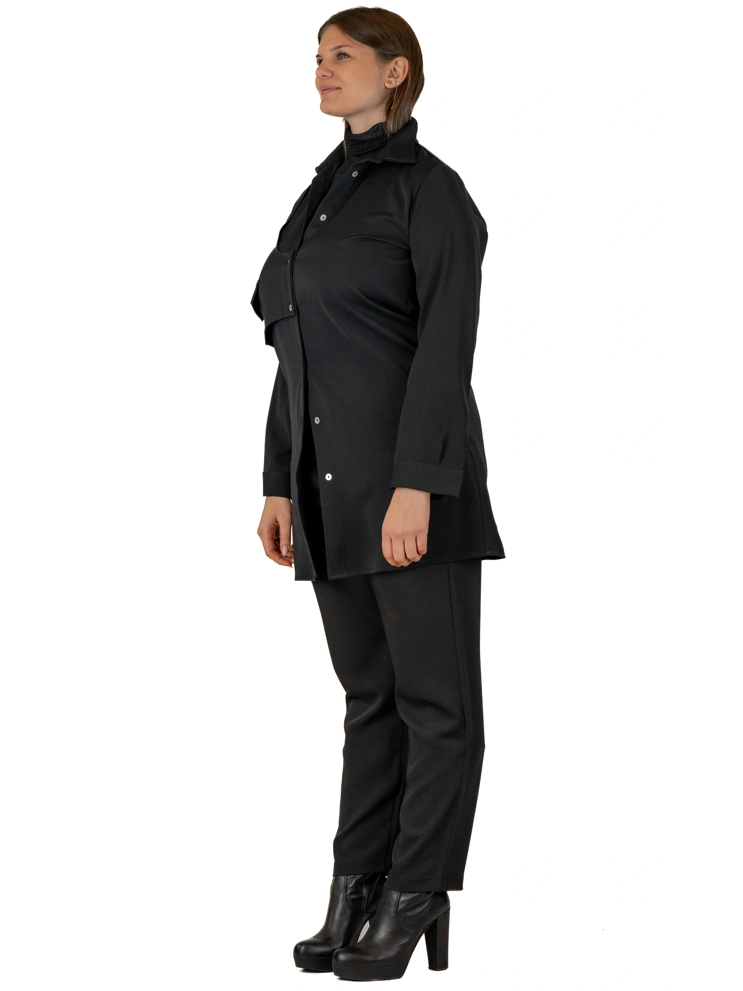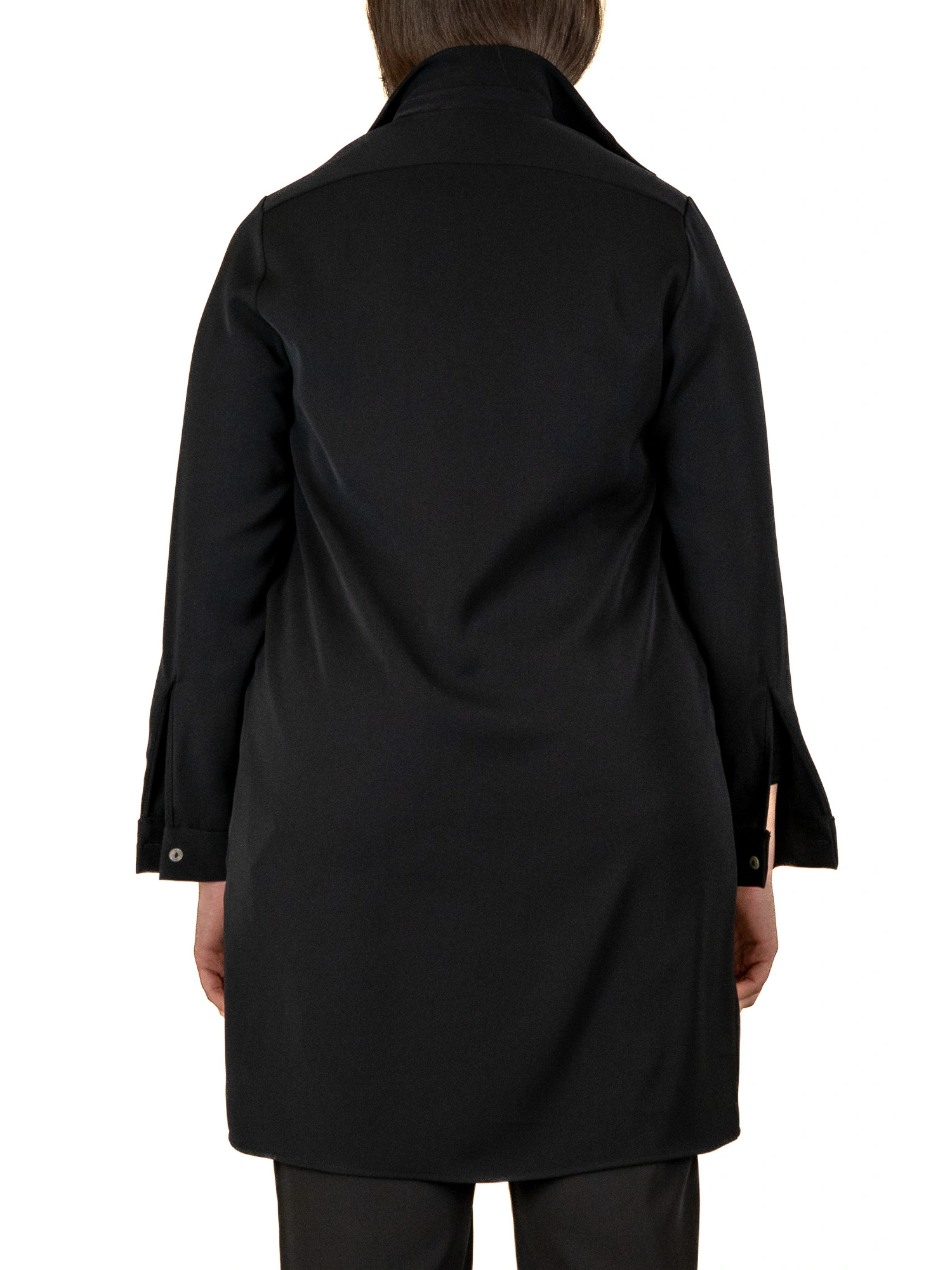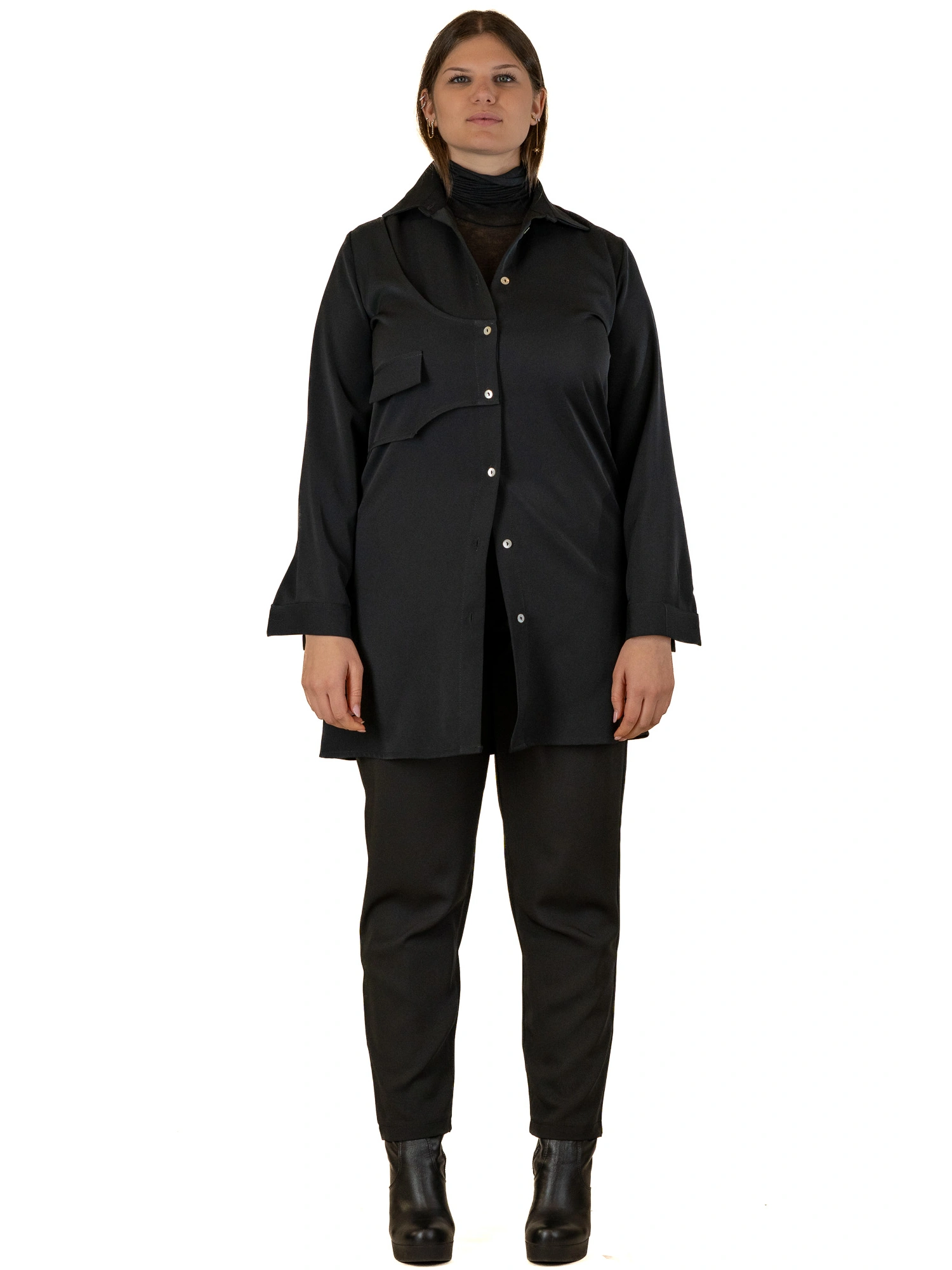 CAMICIA GIACCA MODERNA DAL DESIGN DECISO, CON TASCHE GEOMETRICHE E BOTTONI A PRESSIONE. LINEA PULITA, STILE URBANO. UN CAPO VERSATILE PER LOOK DAL CARATTERE CONTEMPORANEO. LA MODELLA È ALTA 170 CM E INDOSSA UNA TAGLIA M.