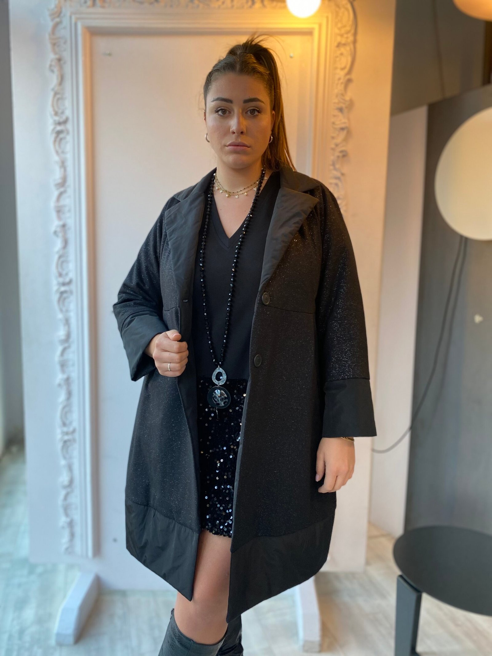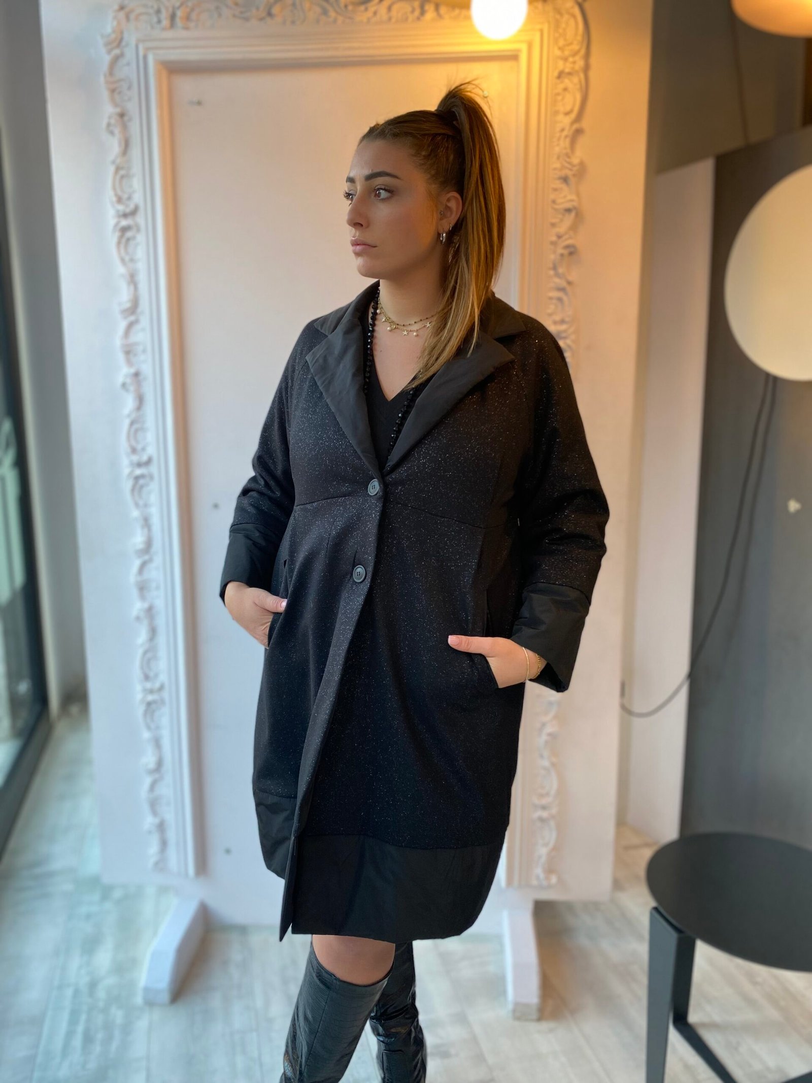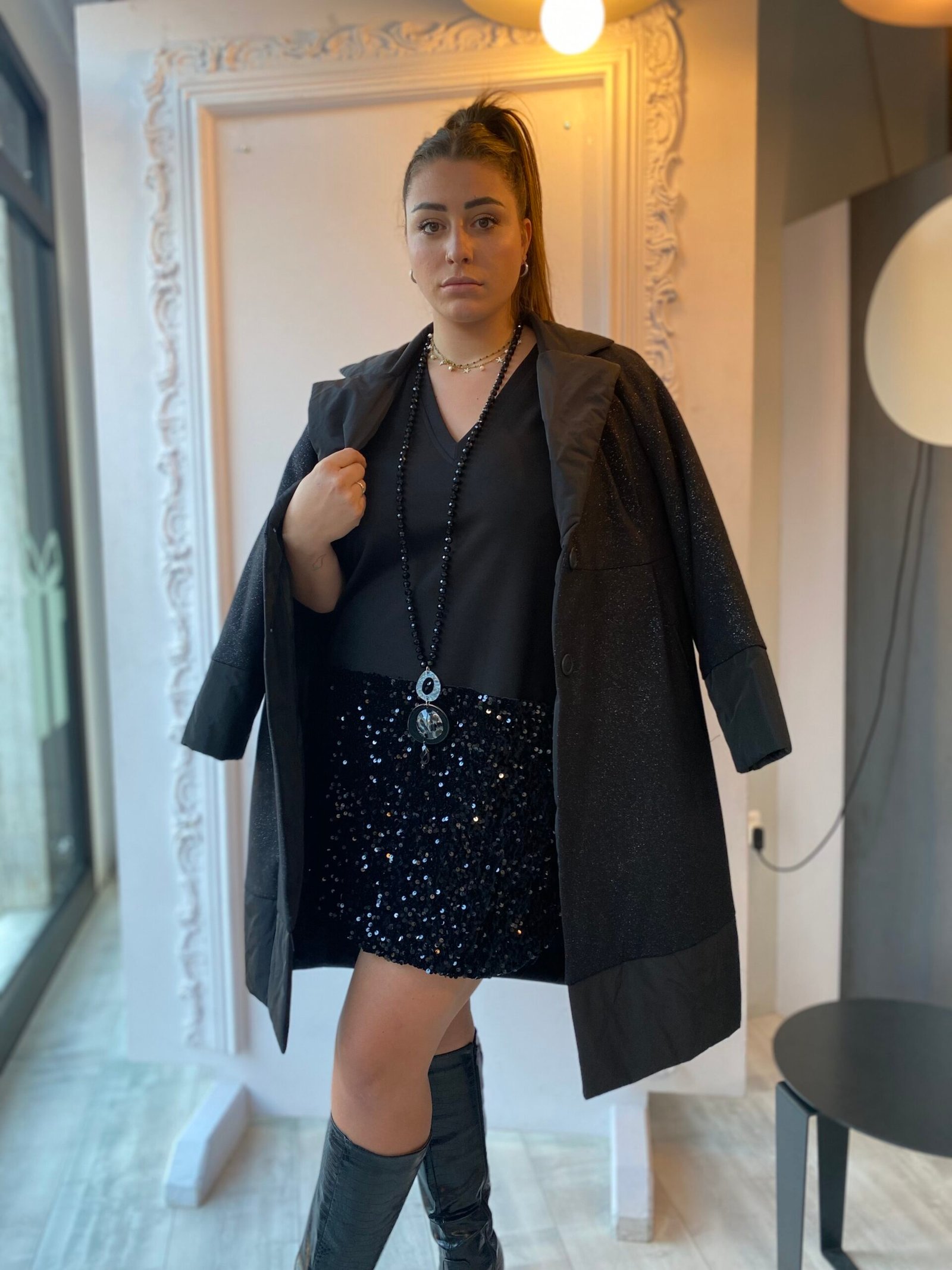 CAPOSPALLA SPARKLE: L’ELEGANZA , IL FASCINO DEL BRILLANTE UN CAPPOTTO CHE NON PASSA INOSSERVATO: IL TESSUTO PUNTEGGIATO DI MICRO BRILLANTINI DONA LUCE AD OGNI MOVIMENTO, TRASFORMANDO UN CAPO INVERNALE IN UN VERO STATEMENT DI STILE. IL TAGLIO MORBIDO E LUNGHEZZA MIDI OFFRONO COMFORT E PROTEZIONE, MENTRE IL COLLO AMPIO E IL SINGOLO BOTTONE DAVANTI CREANO UNA LINEA PULITA E MODERNA. IL DETTAGLIO TECNICO SUL FONDO COMPLETA IL LOOK CON UN TOCCO URBANO E CONTEMPORANEO. INDOSSALO CON UN JEANS E SNEAKERS PER IL GIORNO, O SU UN TOTAL LOOK NERO PER LA SERA: SARAI SEMPRE LUMINOSA, SENZA RINUNCIARE AL CALORE.