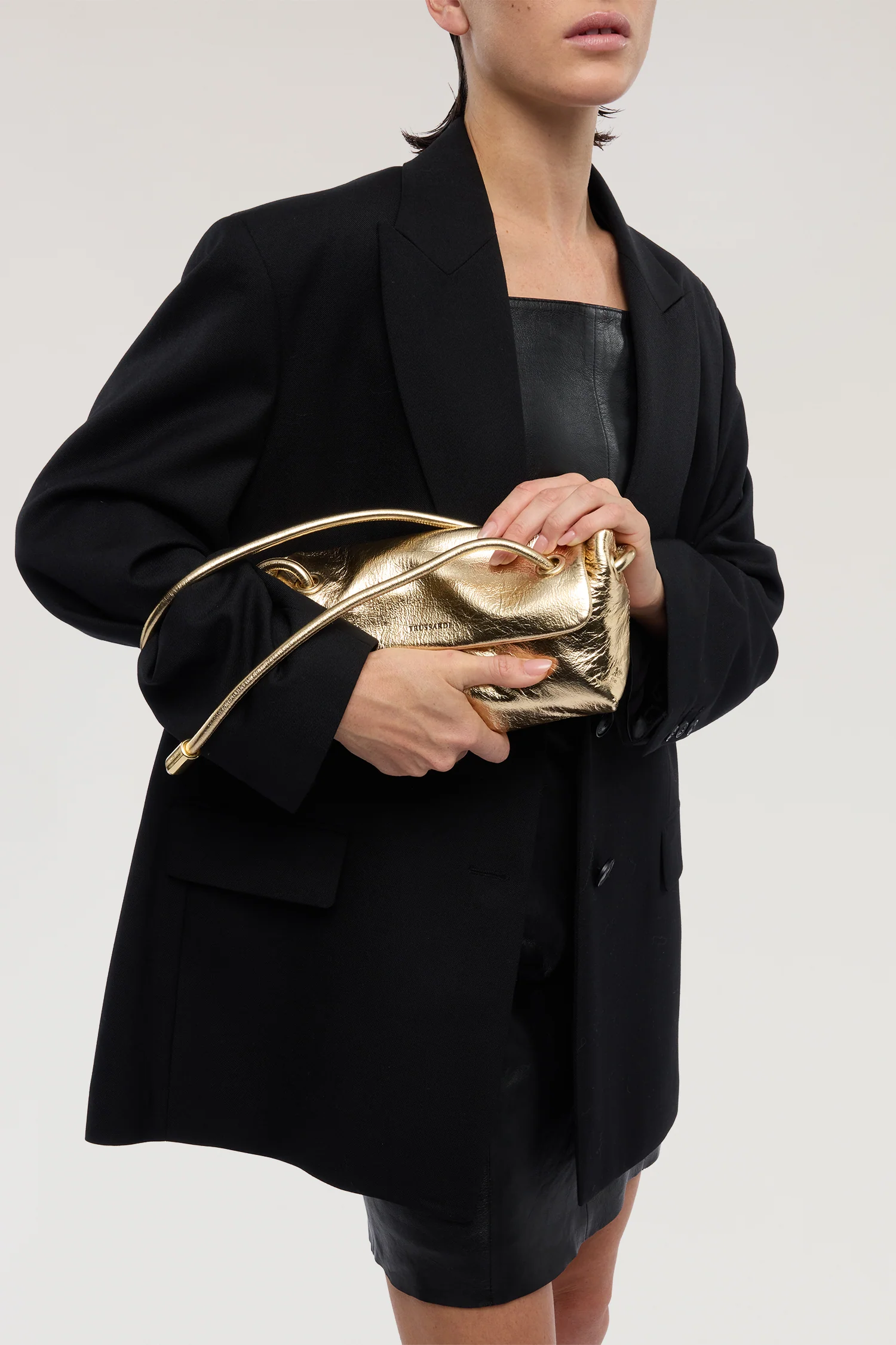 Borsa a tracolla Orbita mini in vera pelle con finitura dorata, tracolla che orbita intorno alla borsa, portabile a tracolla e spalla, dimensioni 23x13x9 cm.
